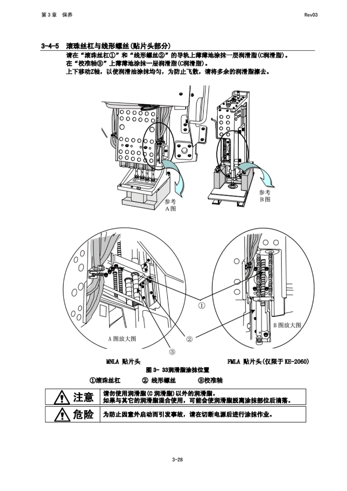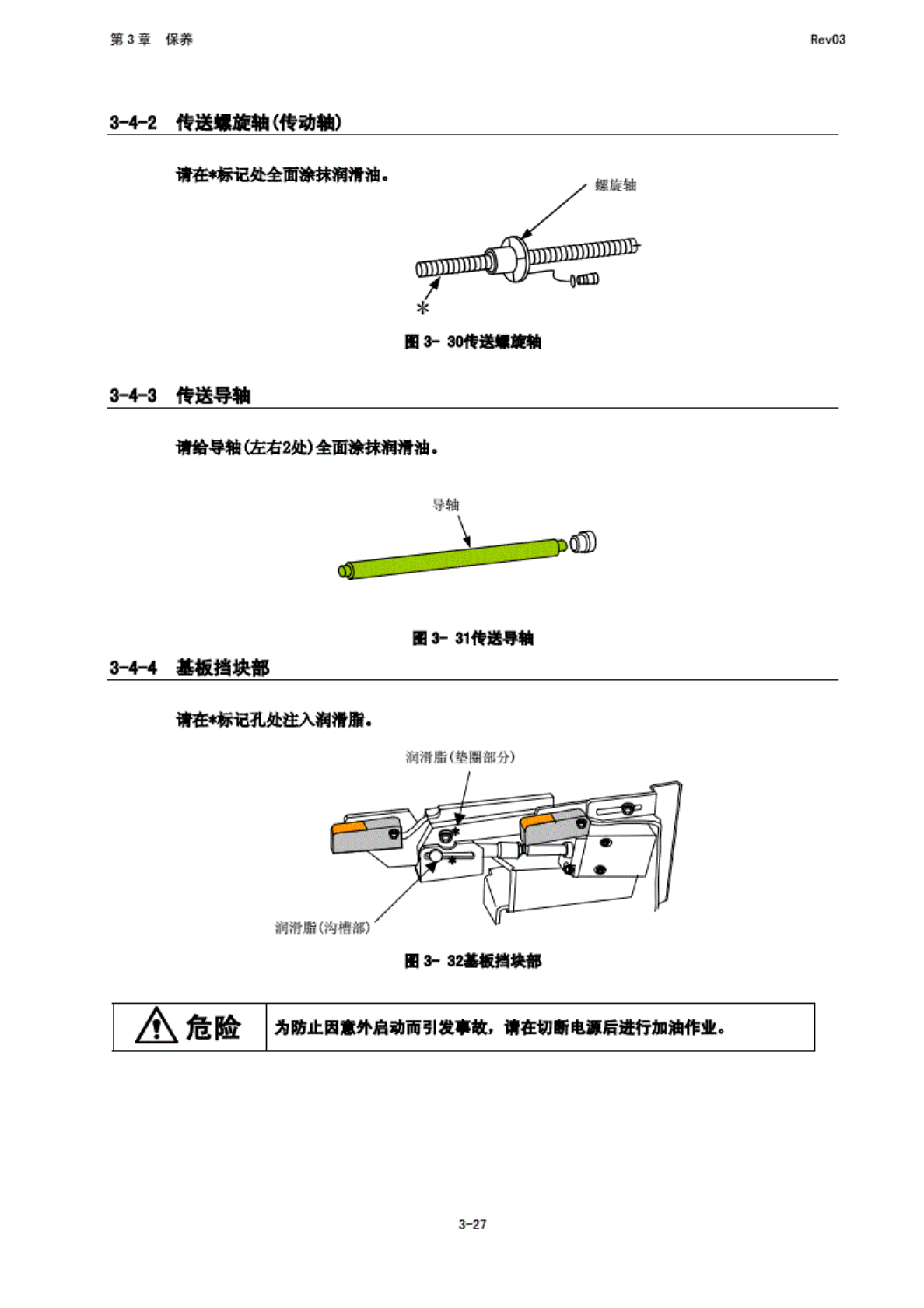 第 3 章 保养 Rev03 3-4-2 检送 惠旋轴 (传 动轴) 律由* 标记处 全面 涂抹润 滑油. Ml M 如传送 务施轴 3-4-3 袋送 导轴 请 鲁导轴 依右 2 处) 全 面源抹 润滑油 . 3~1 基板 挡块部 * 触 硕 a> 31 传 送导轴 请在啕 B 孔处注 入润清 用. 过酒嘴 (垫 圈 部分) IB 3- 耀基板 措块部 危睑 为 防 止因意 外启动 而引发 事散, 请 在切 断电源 后进 行加油 …