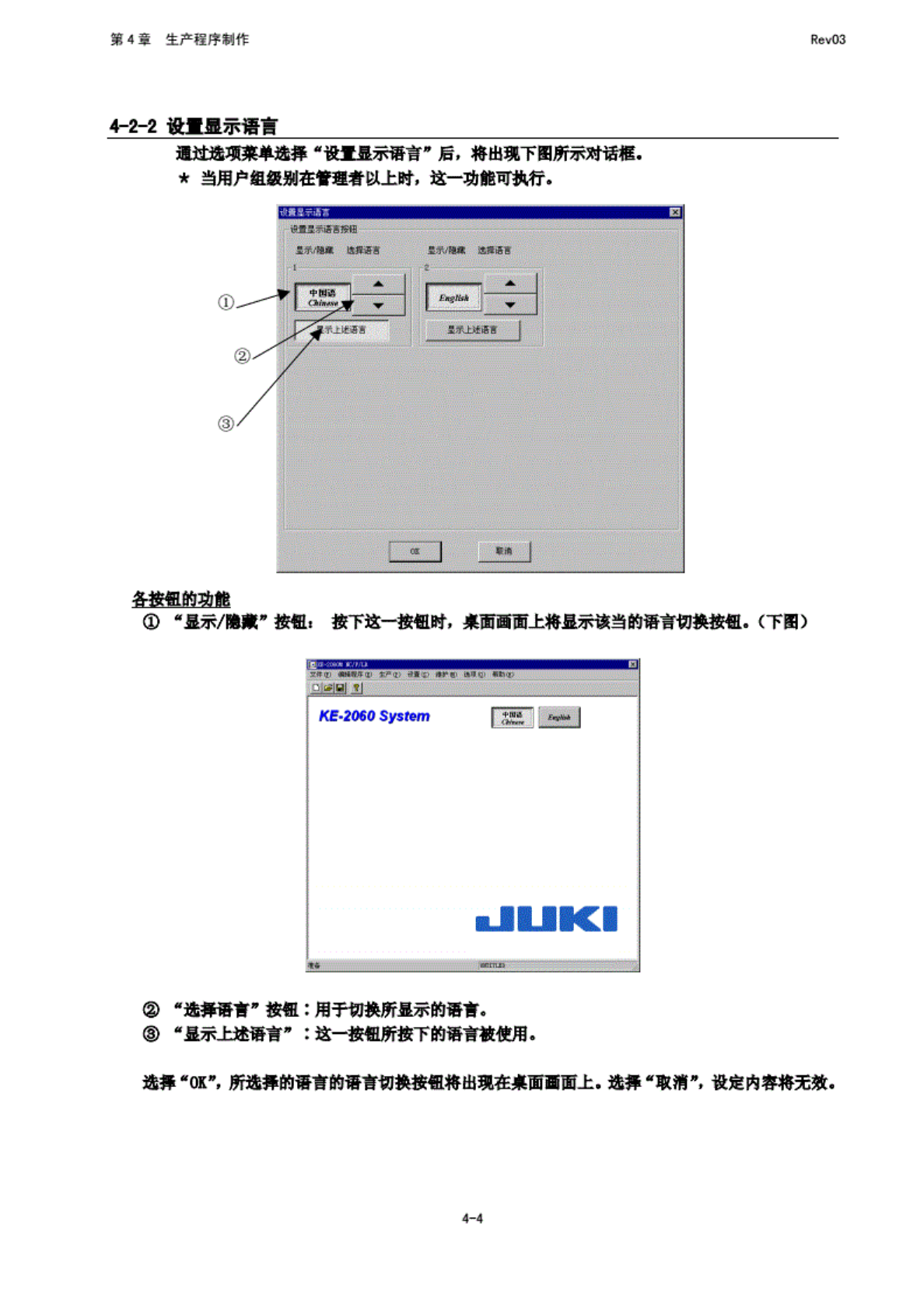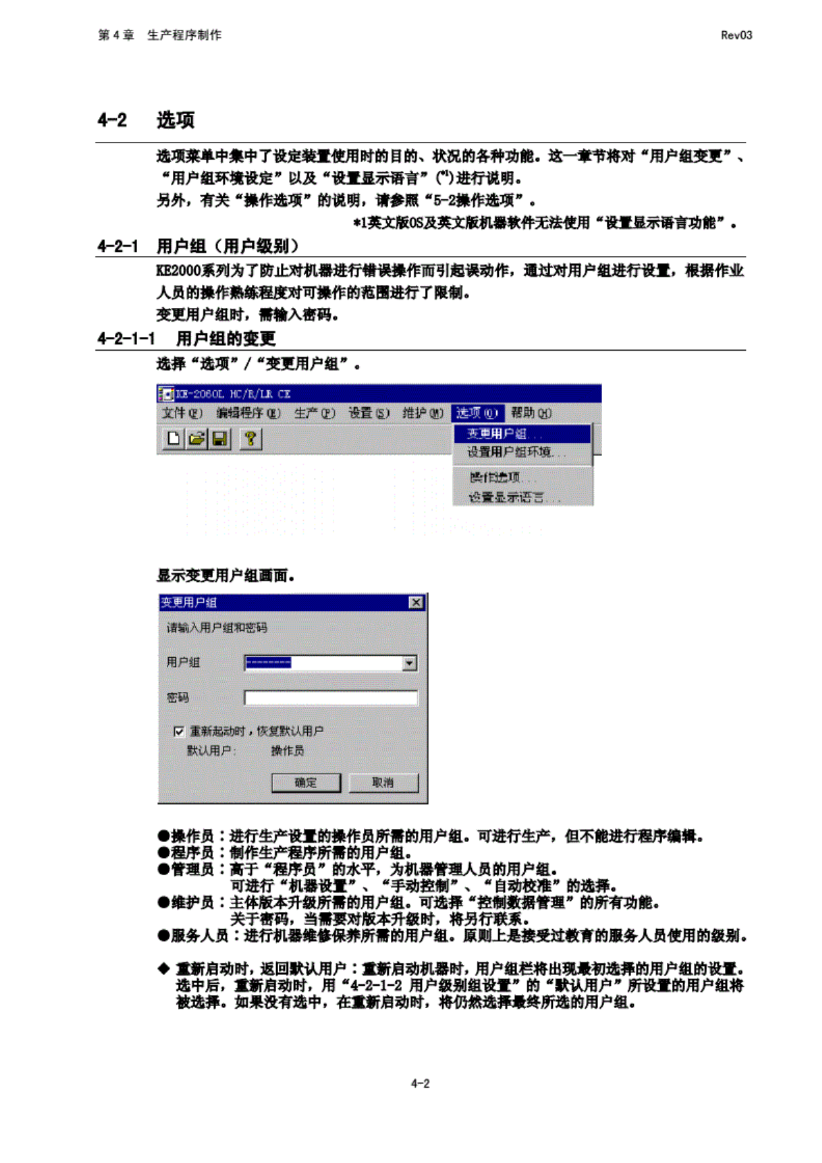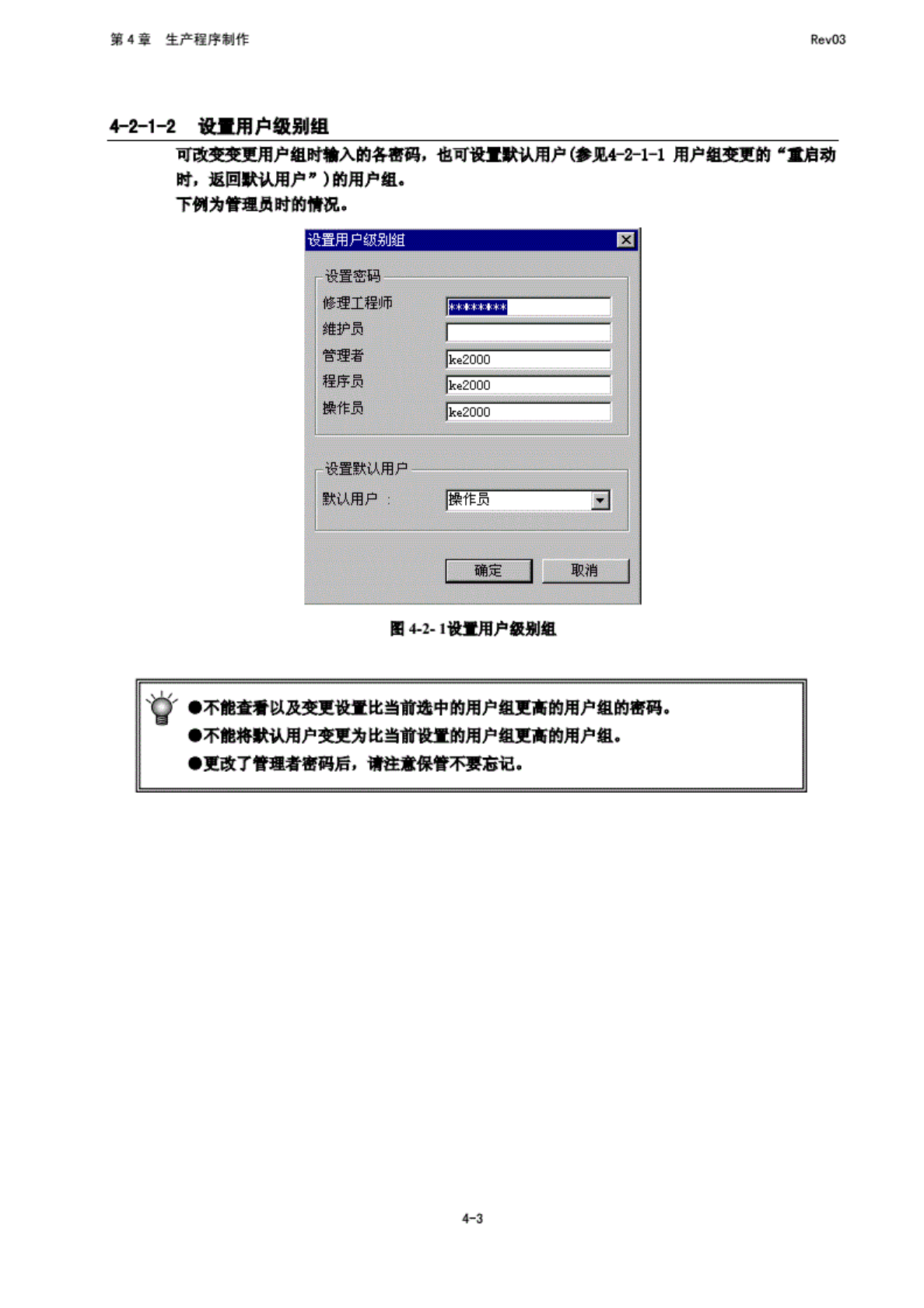 第 4 章 生产程 序制作 Rev03 4-Z -2 设 置用户 级别倒 可 政变变 更用户 组暗输 入的 各羽叶 也可 设置默 认用户 (春盼 既 1T 用户组 变更的 "型动 府, 返 回默认 用户” ) 的用 户组. 下例 为管理 员时的 情况. 图 4-2- 1 设置 用户级 别跟 、 0' 不能 查看以 技变更 设置比 当前逸 中的用 户值更 高的用 户里的 喜玛。 ・不 能的 t 认用户 变更为 比 当…