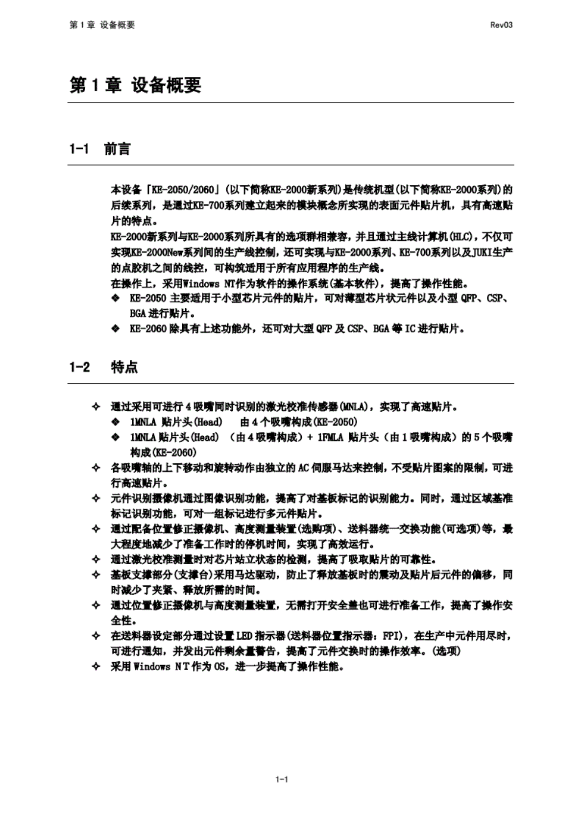 第 1 章 设 备概要 RevO3 第 1 章 设 备概要 1-1 前言 本设备 『KE-20RV2060」 (以 下简 泳党000 新 系列) 是传财 I 型 (以 下简称 KE-2WX) 系列) 的 后跳 系列, 是遗过 KE-7M 系列建 立起来 的模块 概念 所实现 的表面 元件贴 片机, 具有 高速贴 片的 特点. KE-2000 新 系列与 KE-2M0 系 列所具 有的选 项群相 兼容, 井且通 过主线 计算机 M0, 不…