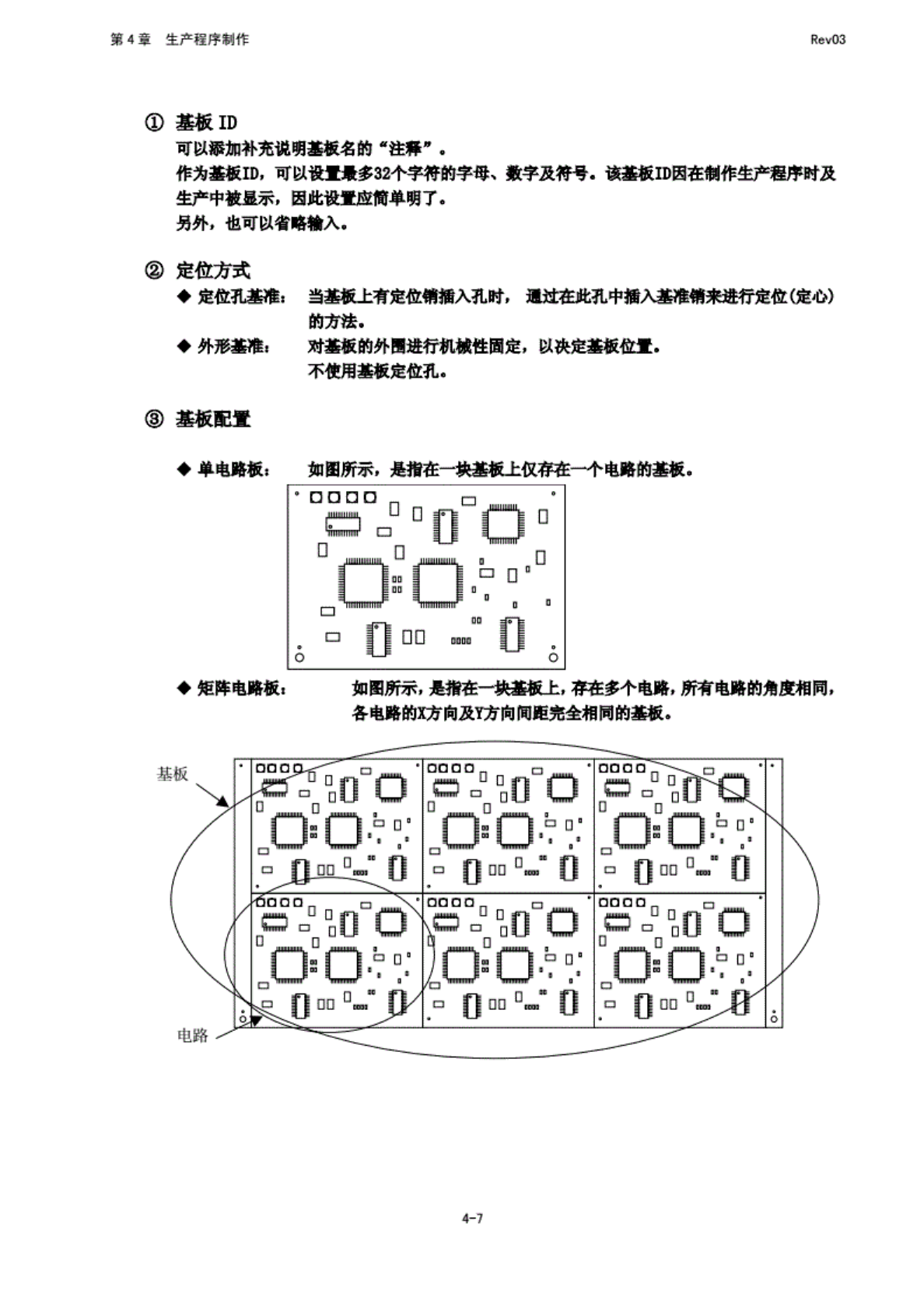 第 4 章 生产程 序制作 Rev03 鳏 ID 可 以添加 补充 说明基 板名的 "注碑 心 . 作 为基板 ID, 可以 设置量 去配个 字符的 字母、 数字及 符号. 该基板 ID 因 在制作 生产程 序时及 生 产中被 显示, 因此 设置应 筒单 明了, 另外' 也可以 省略 输入. 定 位方式 .定 位孔 基雅: .外 形基涵 当基机 上 有定位 弹插入 孔时, 通过 在此孔 中插入 基准策 来进行 定位保…