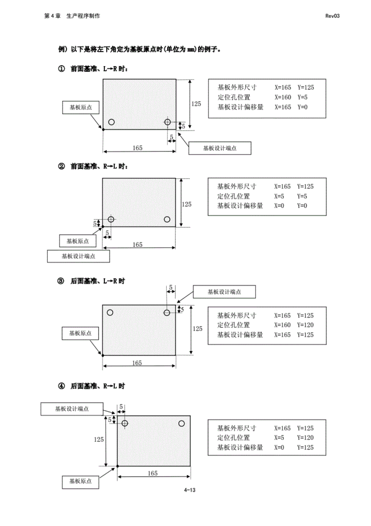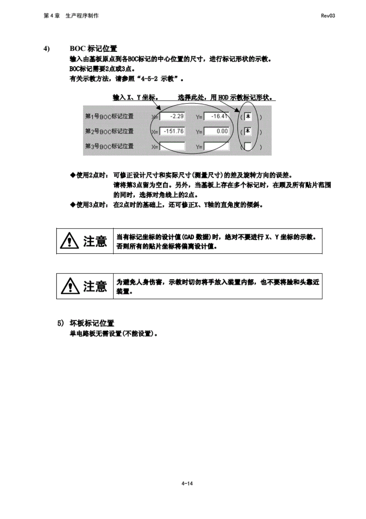 第 4 章 生产程 序制作 Rev03 4) BOC 标 记位置 输入由 基板原 点到各 BOC 标记 的中」 Mt 量的 尺寸, 遂行标 记形状 的示热 BO 相 5 洞?2 点北焦 有 关示教 方法, *照 *全5-2 示 教” . 使用 2 点时 I 可修正 设计尺 寸和实 际尺寸 (漏 量尺 寸) 的差及 旋转方 向的 误差. 请将第 3 点留为 空白. 另外, 当 基板上 存在多 个标记 时. 在题及 所有书 片萄国 的 同…
