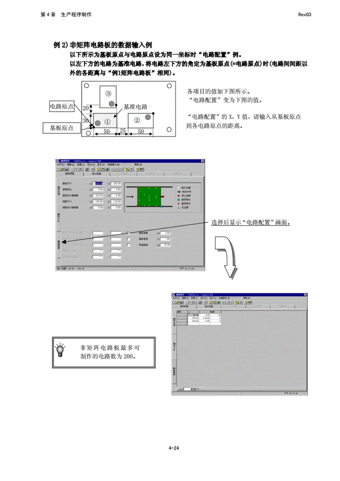 第 4 章 生产程 序制作 Rev03 例 2) 三 晚阵电 路板的 敷据输 入例 以下所 示为基 板原点 与电蹄 原点设 为同一 坐标时 "电路 W 例. 以左下 方的电 略 为基 准电即 将电 第左下 方的角 定为基 板原点 仁 电路原 点) 肘 (电 蹄间 间足以 外的各 距离与 “例 1 知阵 电路板 ” 相 同). 各项 目的值 如下图 所可% “电路 配置” 变 为下图 的值. “电 路配置 ”的 X, y 值, …