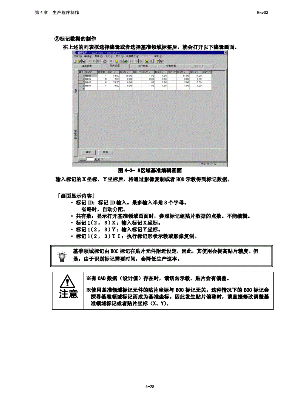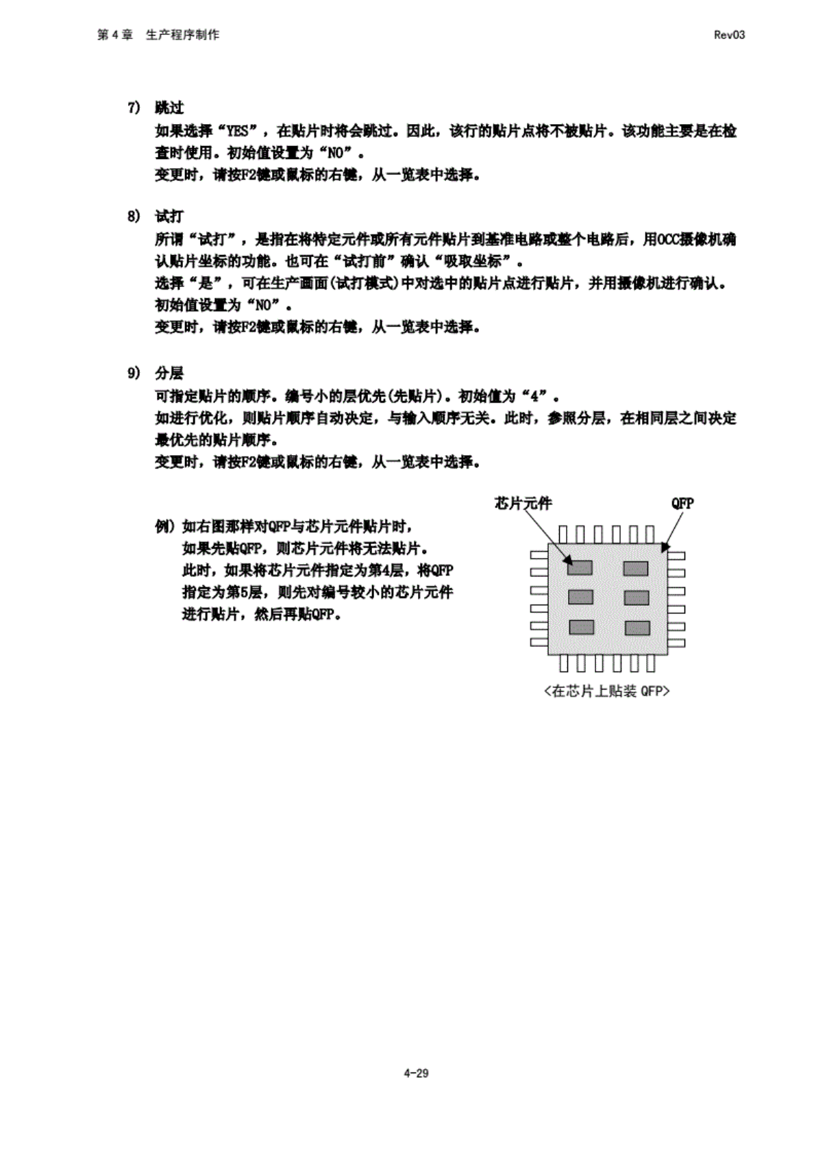 第 4 章 生产程 序制作 Rev03 7) 跳过 如 果选择 -YESw , 在贴 片时 精会险 因此. 该行的 贴片点 将不被 贴片。 该功 能主 3? 是在检 意时 使用. 初始里 设置为 "NO* * 变 更暗, 请掷 2 处或 就标的 右鞋, 从一览 表中 选择. 3) 试打 所谓 “试 打. - 是指在 将特 定元件 或所 有元件 贴片 到基准 电路或 整个电 路后, 用 0C 网 t 机确 认贴片 坐标的 功能.…