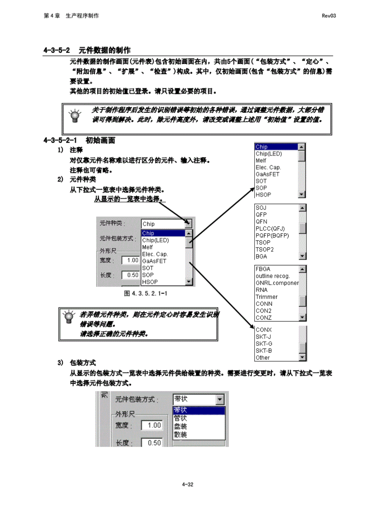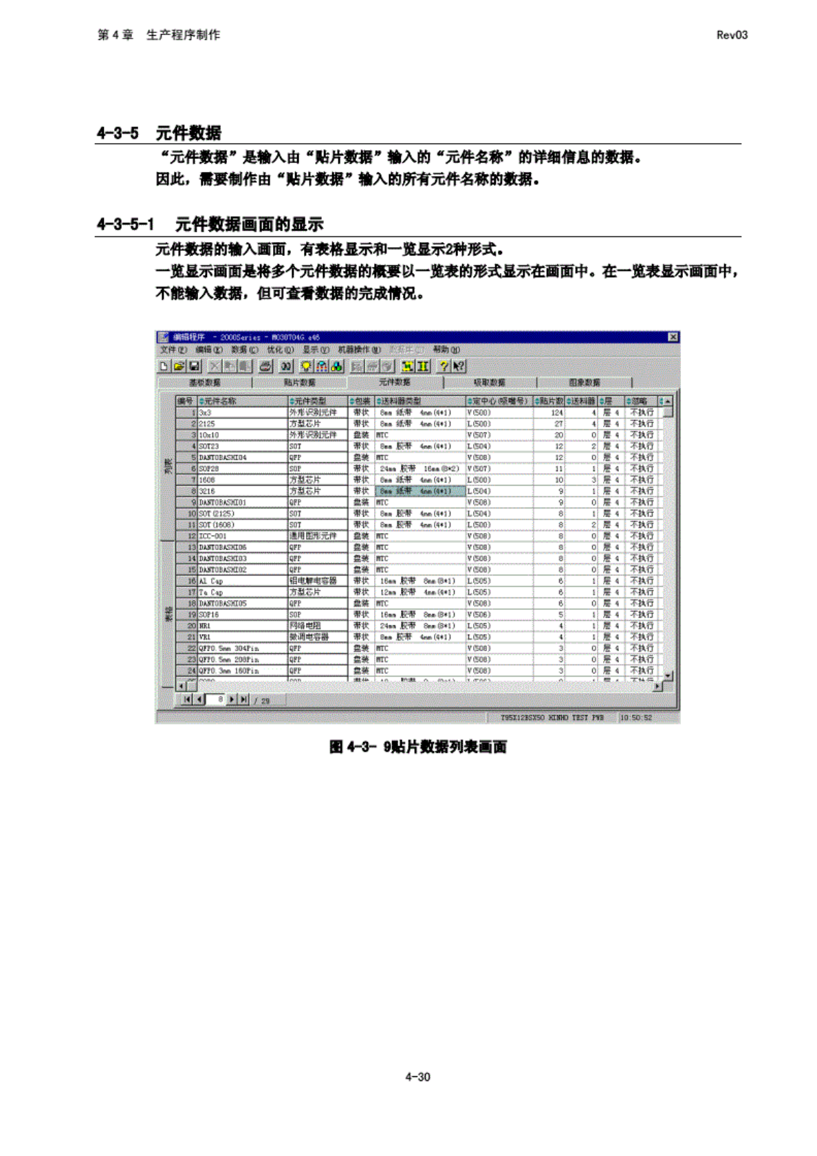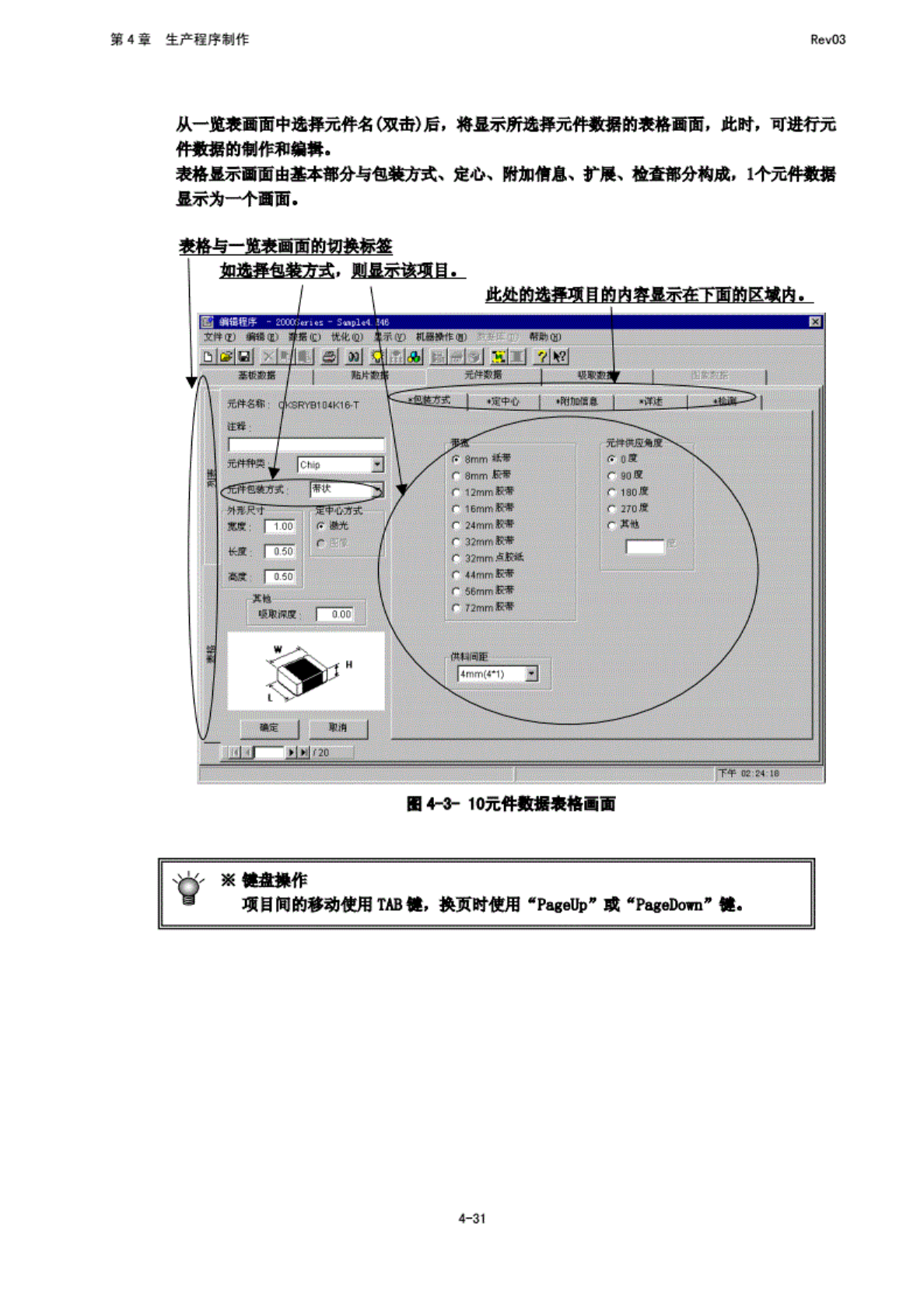 第 4 章 生产程 序制作 Rev03 从一览 表画面 中选择 元件名 (双 击) 后, 将显 示所选 择元件 蒙据 的表格 画面, 此时, 可 进行元 件 数据的 制作和 编辑. 表格显 示画面 由基本 部分与 包装方 式. 定心. 附加 信息, 扩展, 检查 部分构 成一 个元件 数据 显 示为一 个面 面. 表格与 一览表 画面的 切换期 如选 择包装 方式. 则 显示该 项目. 此处 的选择 项目的 内容显 示在下 面的区 域内…