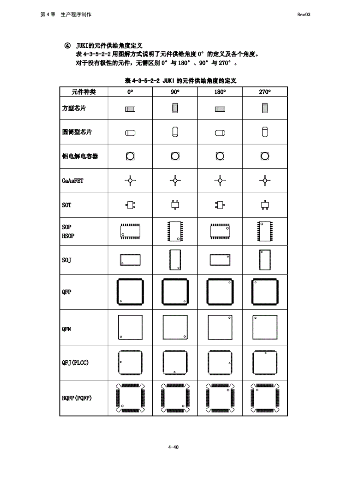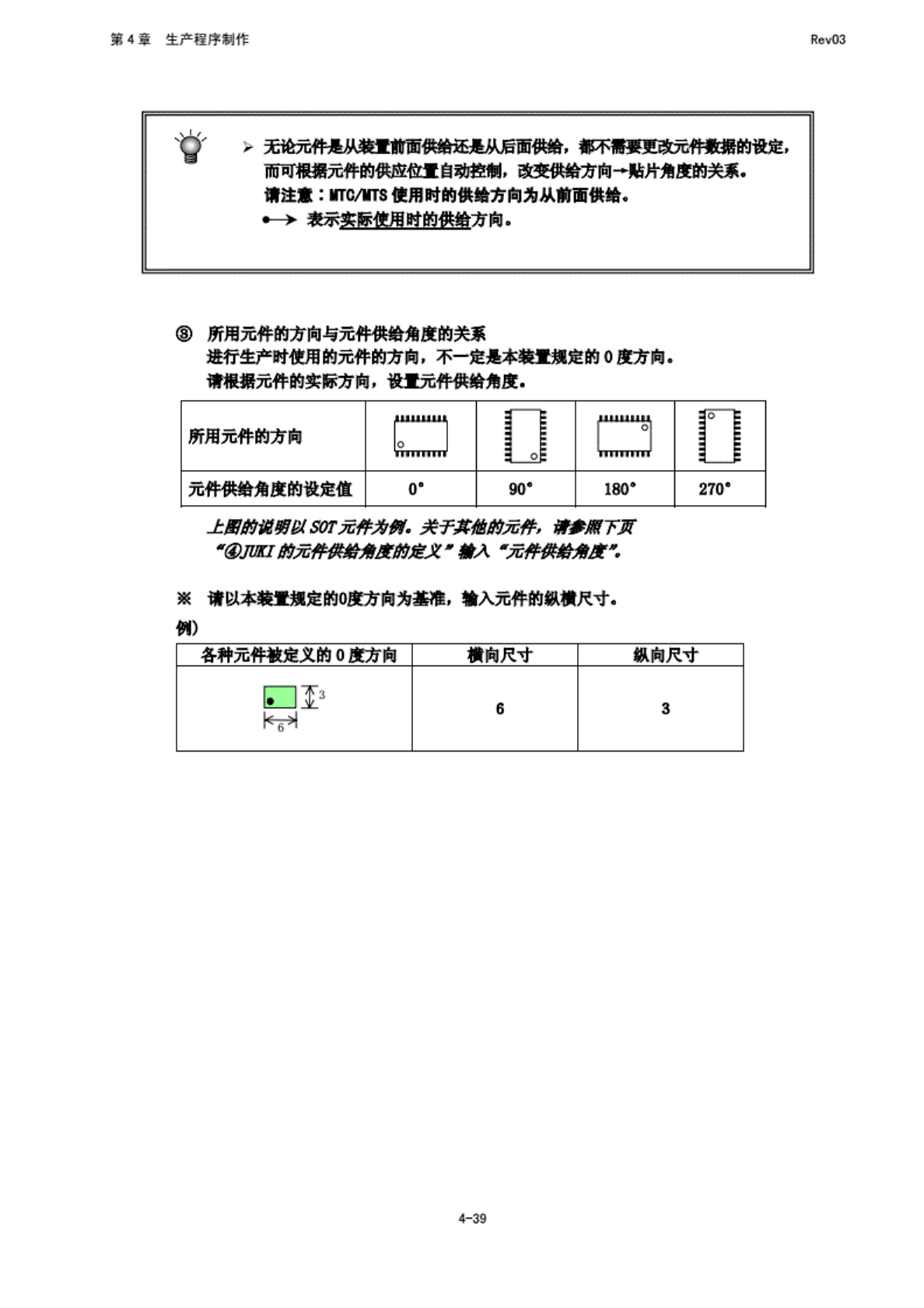 第 4 章 生产程 序制作 Rev03 a 无论 元件是 从蓑 mm 能疑是 从后面 供给, 都不需 要更改 元科费 g 的 设定, 而 可根据 元件的 供应位 置自 动控 制, 改变供 给方向 - 贴件 角度的 关系. 埔注意 : HTMirs 使 用时的 供赣方 向为从 前面 供给. i 表示 实际使 用晴的 供给方 向. 所用 元件的 方向与 元件供 给角度 的关系 进行 生产时 使用的 元件的 方向, 不 一定是 本装置 规定的…