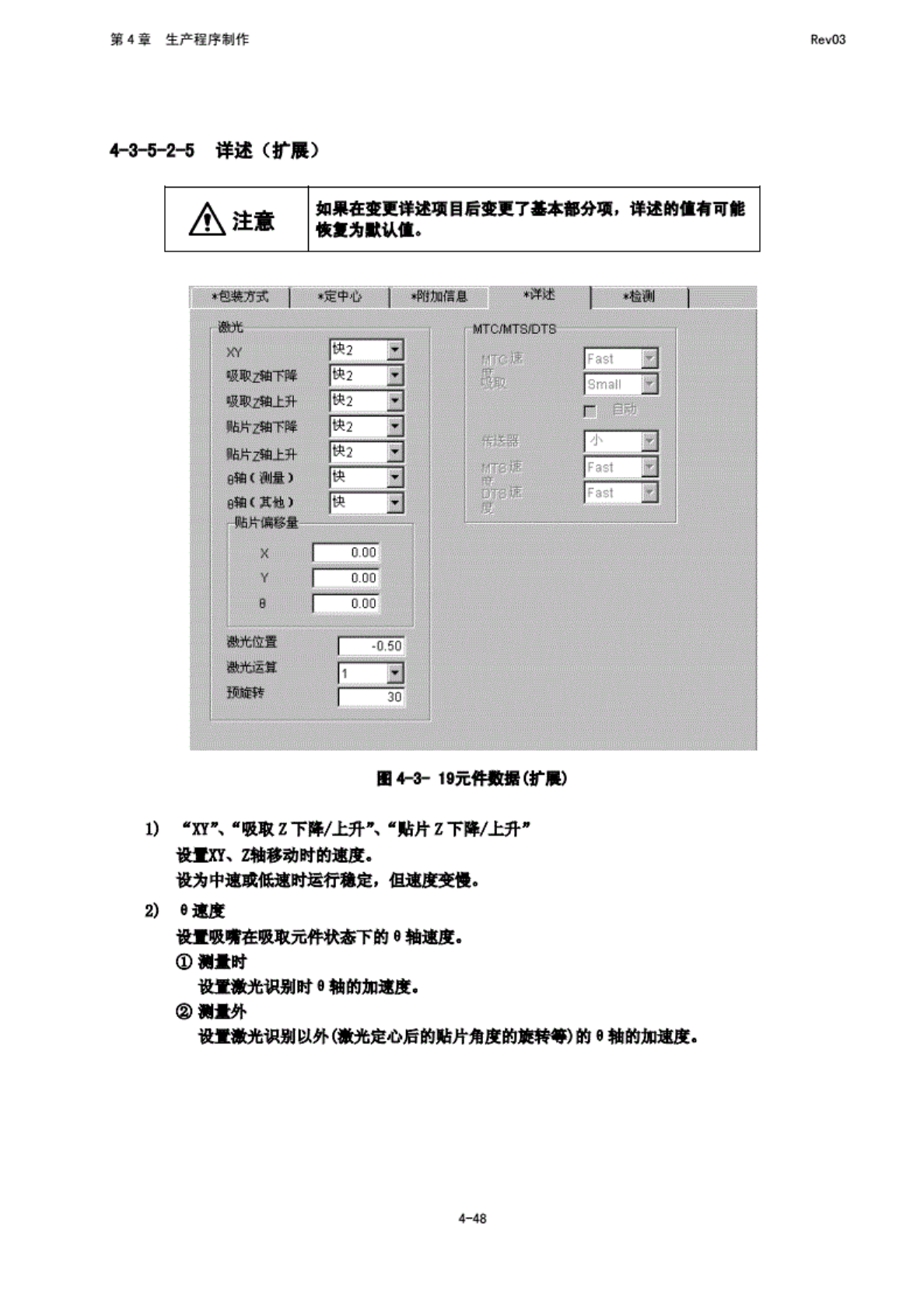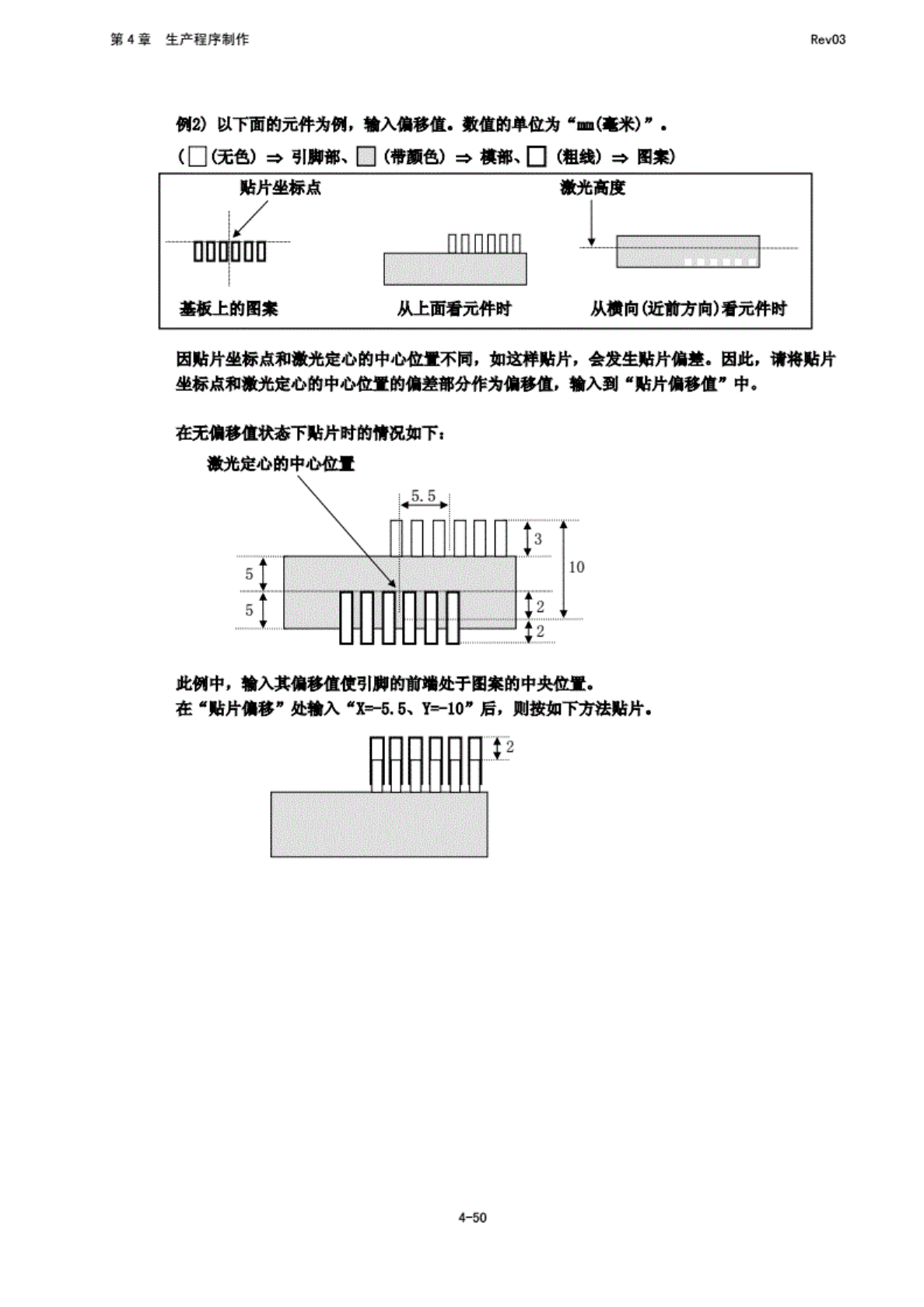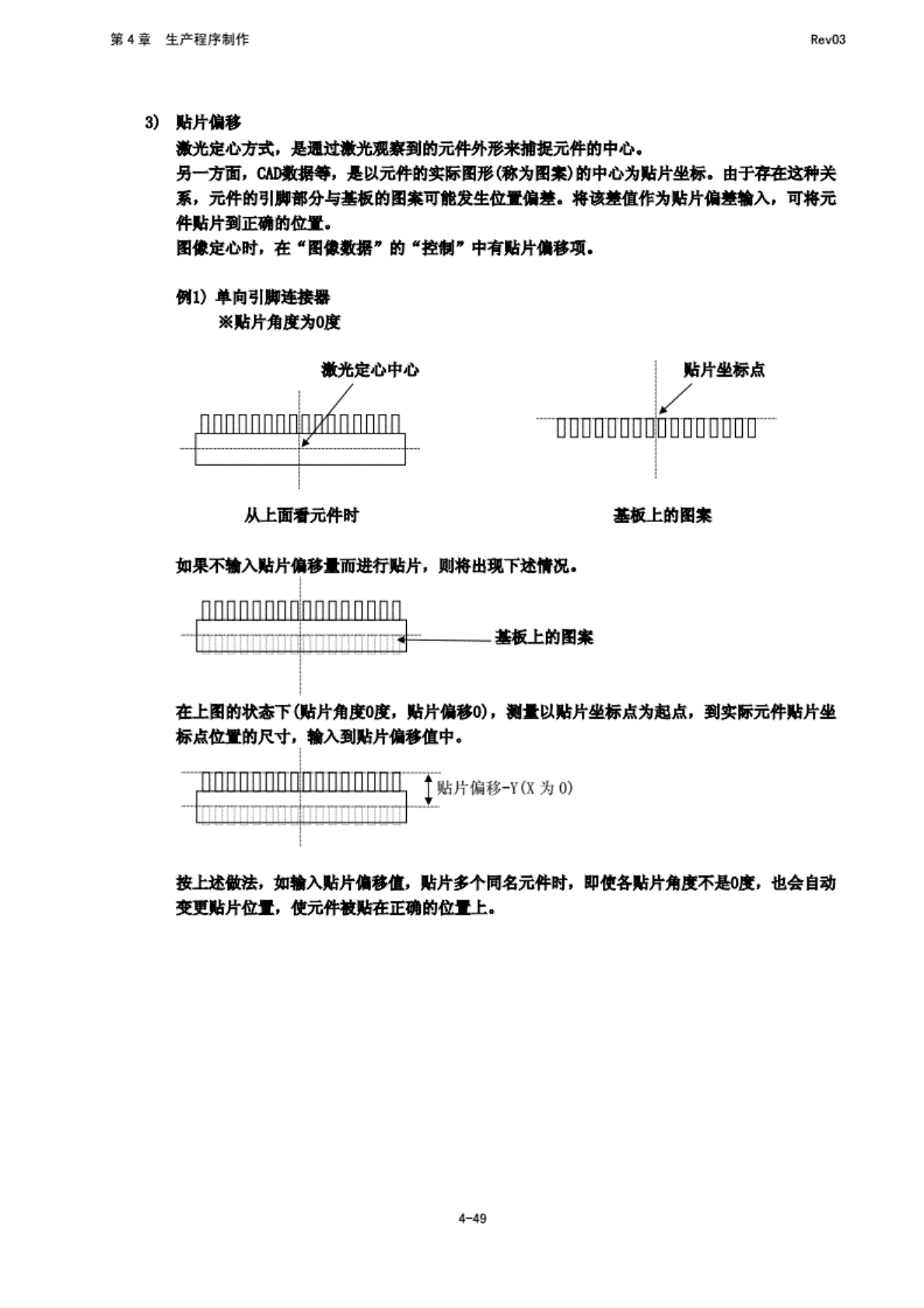 第 4 章 生产程 序制作 Rev03 3) 贴片 偏移 激 光定心 方式, 是通过 青光 观察到 的元相 外形 来捕捉 元件的 中心. 另一 方面, CAD 数 据箱, 是以元 件的实 际图形 (称为 图案) 的中心 为贴片 坐标. 由于 春在这 洲美 系, 元 件的引 脚部分 与基板 的图案 可能发 生位置 偏差. 将 核差值作为贴 片偏 邮入, 可将元 件 贴片到 正确的 位置. 图 像定心 时, 在 © 图像 数据* 的 “控 …