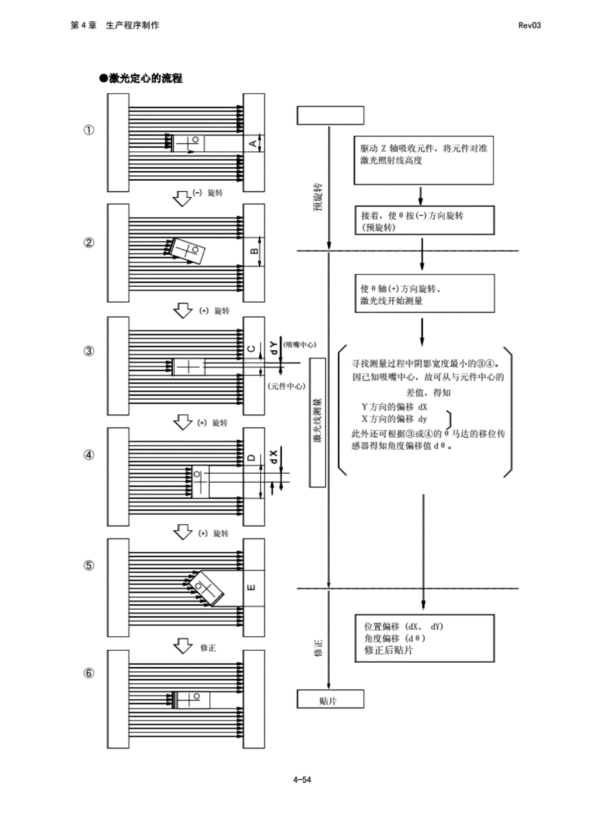 第 4 章 生产程 序制作 Rev03 (曦 嘴中 6) (元件 中心) p .微 测* 过相 中阴 影宽 度通小 的③ :工 因已 知吸嘴 中心, 故可从 三元件 中心的 差值, 得知 Y 方 向的偏 移 dX X 方 向的循 移 的 此外 注可根 据③或 马达的 移位将 越幽得 如痛度 偏移他 dO. 位置偏 移 CM、 dv) 角度 偏移 30 修正后 贴片 ・缴 光定心 的流程 W 旋转 O M 旋转 ! 二^=1 0] 。 (…