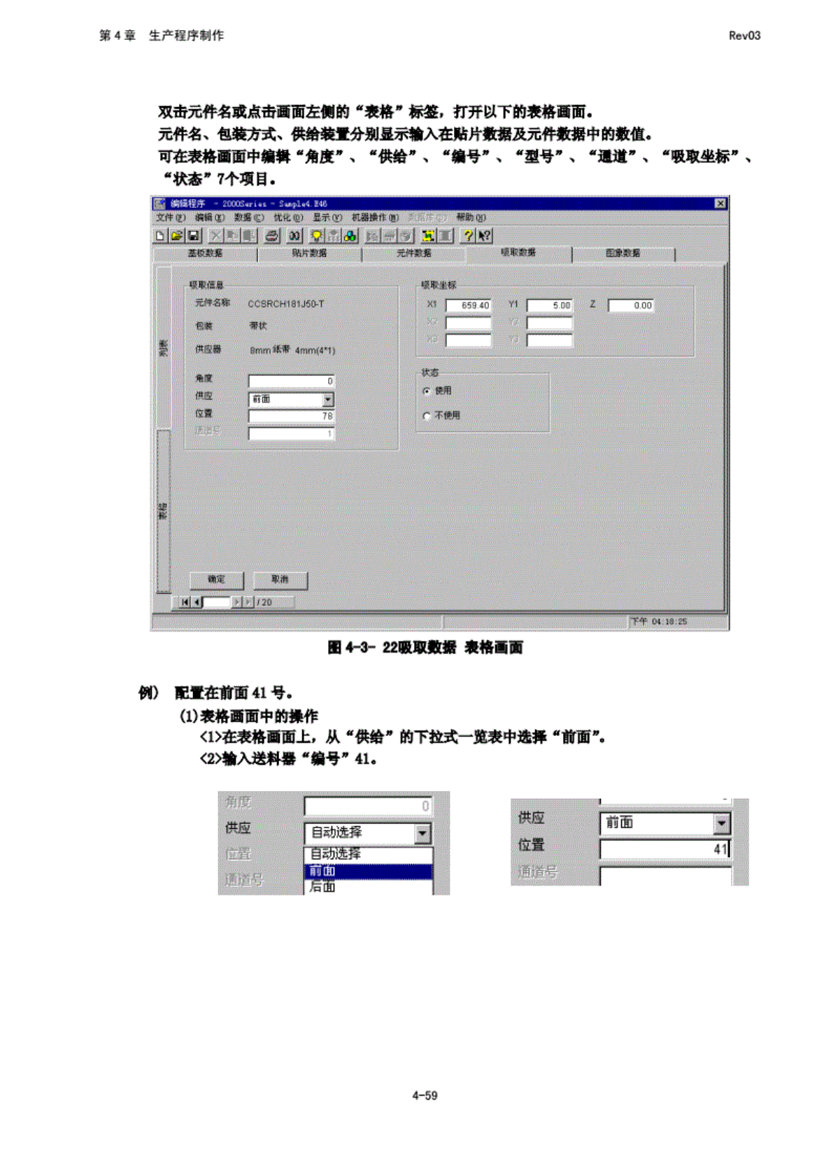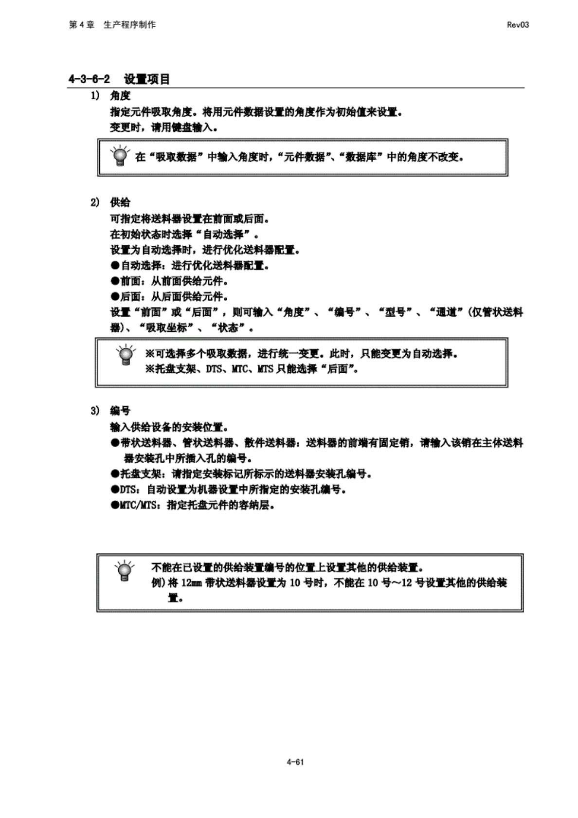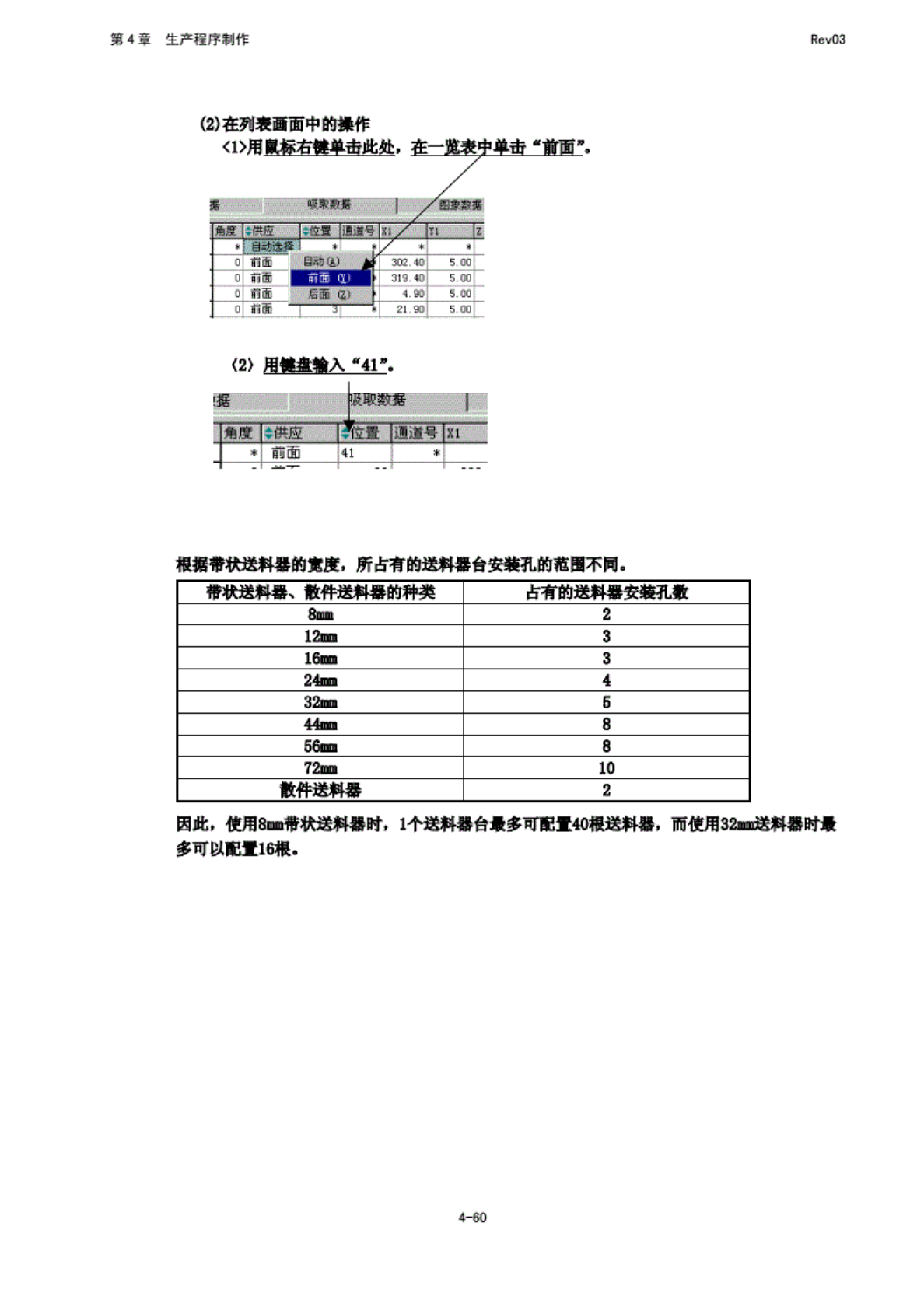 第 4 章 生产程 序制作 Rev03 在列表 画面中 的操作 用 瞭输入 “41% 吸 取簪据 ・E 阡干 IKUfTE 帝面 -41 4 根据 带状送 料器的 宽度, 所占 有的送 粹器台 安装孔 的慈围 不同. 1m m 类 占有 的送料 器安 装孔数 2 12m 3 16<dd 3 24nn 4 32dhi 6 ^^QSQ 8 56的 8 72的 10 散件 送料器 2 因此. 使用 8 加带 状送科 器时, 1 个送 科…