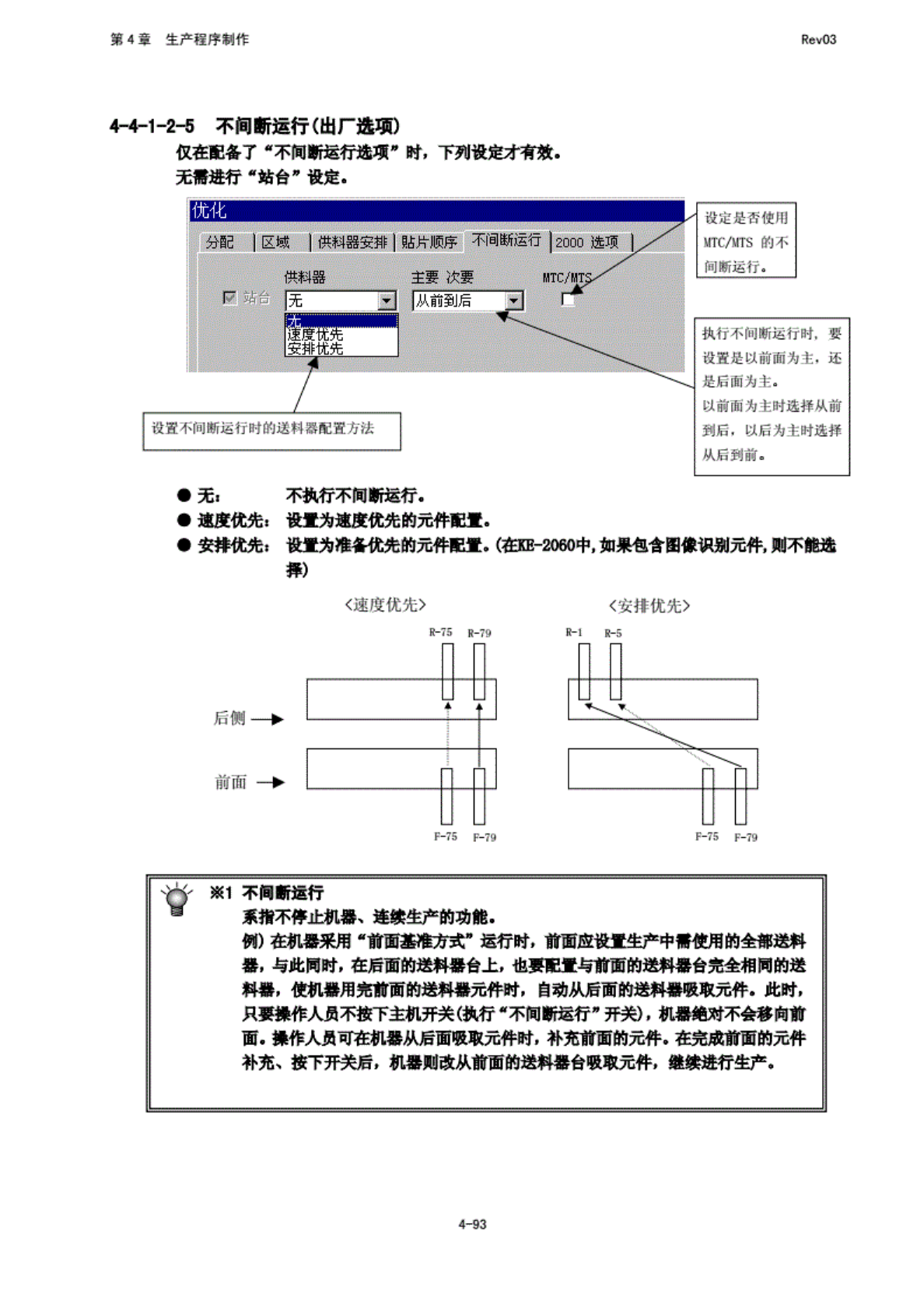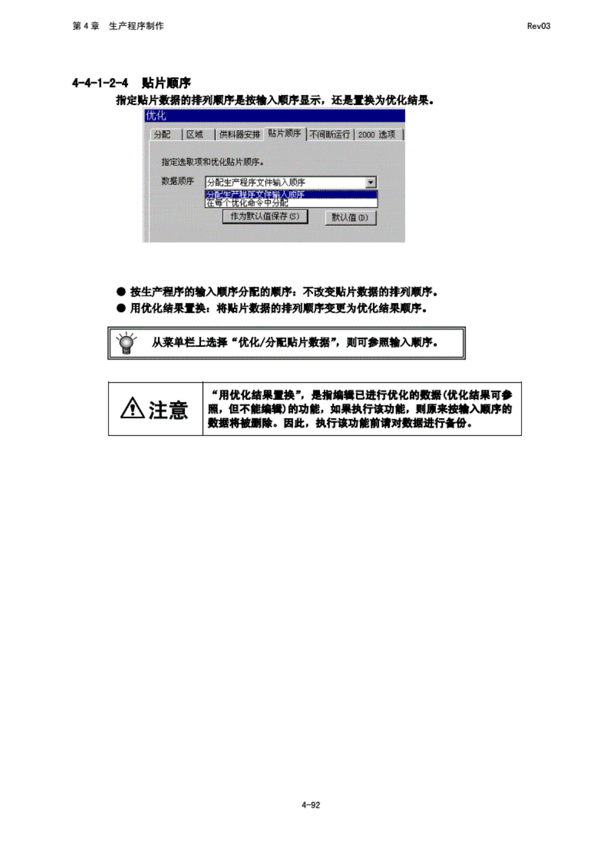 第 4 章 生产程 序制作 Rev03 +MH-2T 曲片 顺序 指 定贴用 Bt 据 的排列 廉序是 按输入 顺序 显示, 还是 量换 为优化 结果. 占配 | 区域 ] 供 *1 我手排 片用 师户 | 不间 断丘行 | 2 顿 造帝 ] 指定选 版项 和光 化贴片 顺序. 数 据膜序 而 寻福菽 择丽丽 3 花 力,认 值探许 4 I 战》 的 欧 • 按生产 程序的 输入* 序分 理 的顺 序, 不改 变贴片 数据的 精列* 序…