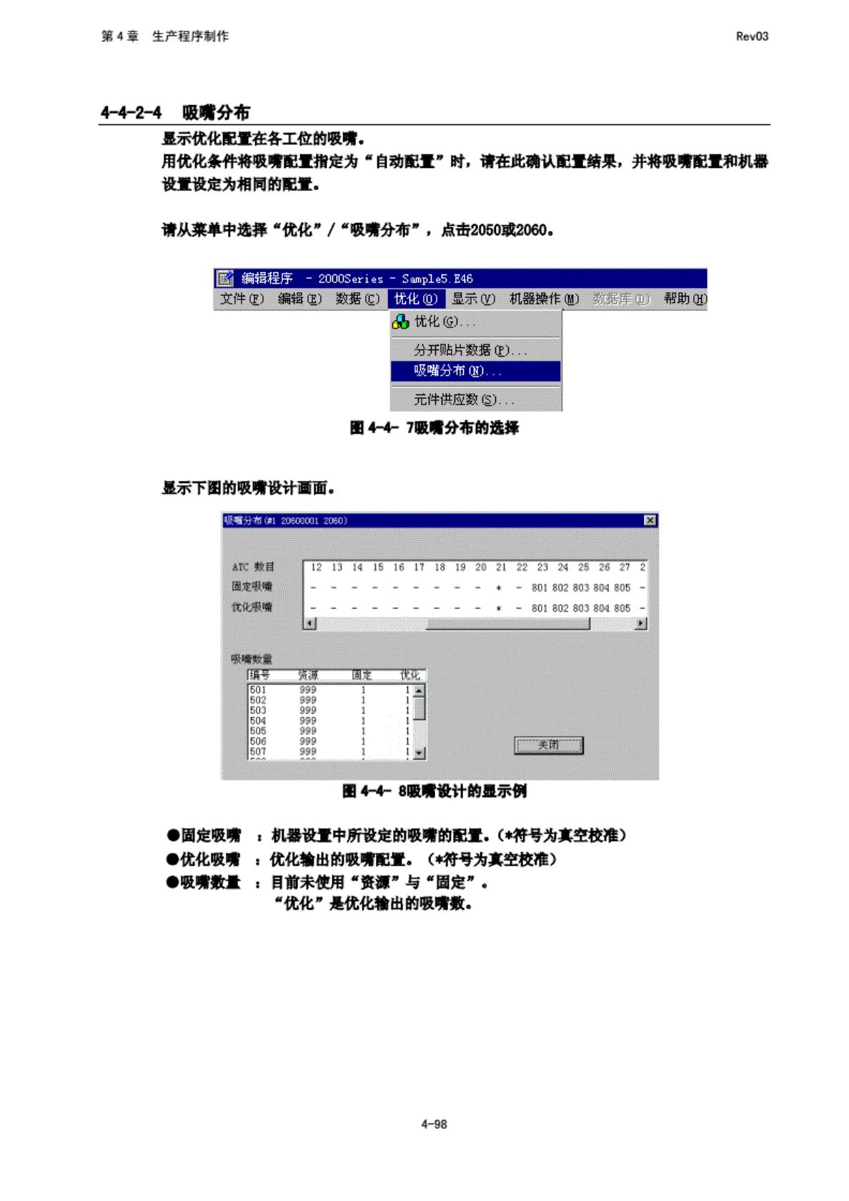 第 4 章 生产程 序制作 Rev03 1■2T 则 I 分布 显示 优化配 量在 各工 田的 吸需. 用优化 条件期 限 需配置 指定为 " 自动 配置中 时, 请在此 确认配 宣器 果, 井将吸 需配置 和机器 设置 设定为 相同的 配置. 清从 菜单 中选择 "优化 0 / "吸瑞 分布* , 点击 2050 或 2060. 圈 编 辑程序 - 2ClClClSeri 文件旧 编辑旧 数据6 显示也 …