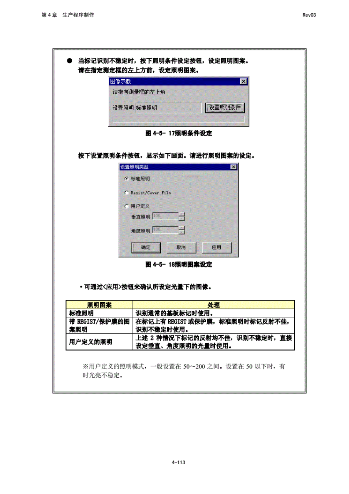 第 4 章 生产程 序制作 Rev03 • 当 林记识 别不稳 定时, 按下 即剪条 件设定 按粗, 设 定照明 图案. 请在 指定需 定植的 左上方 前, 设 定照明 图案. B04-5- 17 照明条 件没定 按下 设置愿 明条件 按钮, 显示 如下 画面. 请进 行照明 图案的 设定3 明 Hi- 18 魏朗图 案设定 , 可通过 应用〉 按钮来 确认所 道定光 量下的 图体. ※用 户定义 的照明 模式, 一般 设置在 50-2…