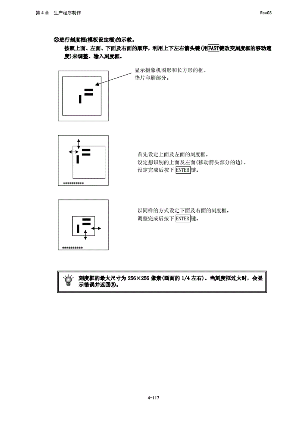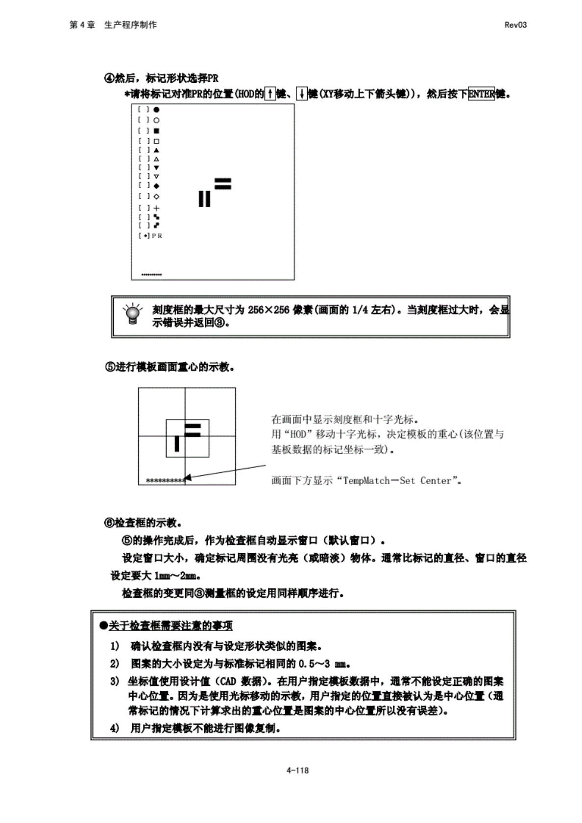 第 4 章 生产程 序制作 Rev03 然后, 标 记形状 选择 环 t f 将标 记对准 PR 的位置 陋施的田施、 团能建v 移动上 下情头 您), 靠 后按下 它 9 刻度根 的最大 尺寸为 256X256 像素 (画 面的 1/4 左右 )。 当刻度 能过 大时, 冒 示错误 井返回 行模板 画面拿 心的示 教。 在 画而中 昆示 刻度 如和卜 字光标 . 用 “H00 ” 移动 十; 光标, 决 定模板 的重心 (核 位置」 …