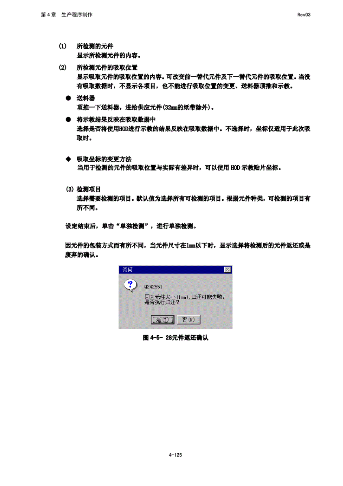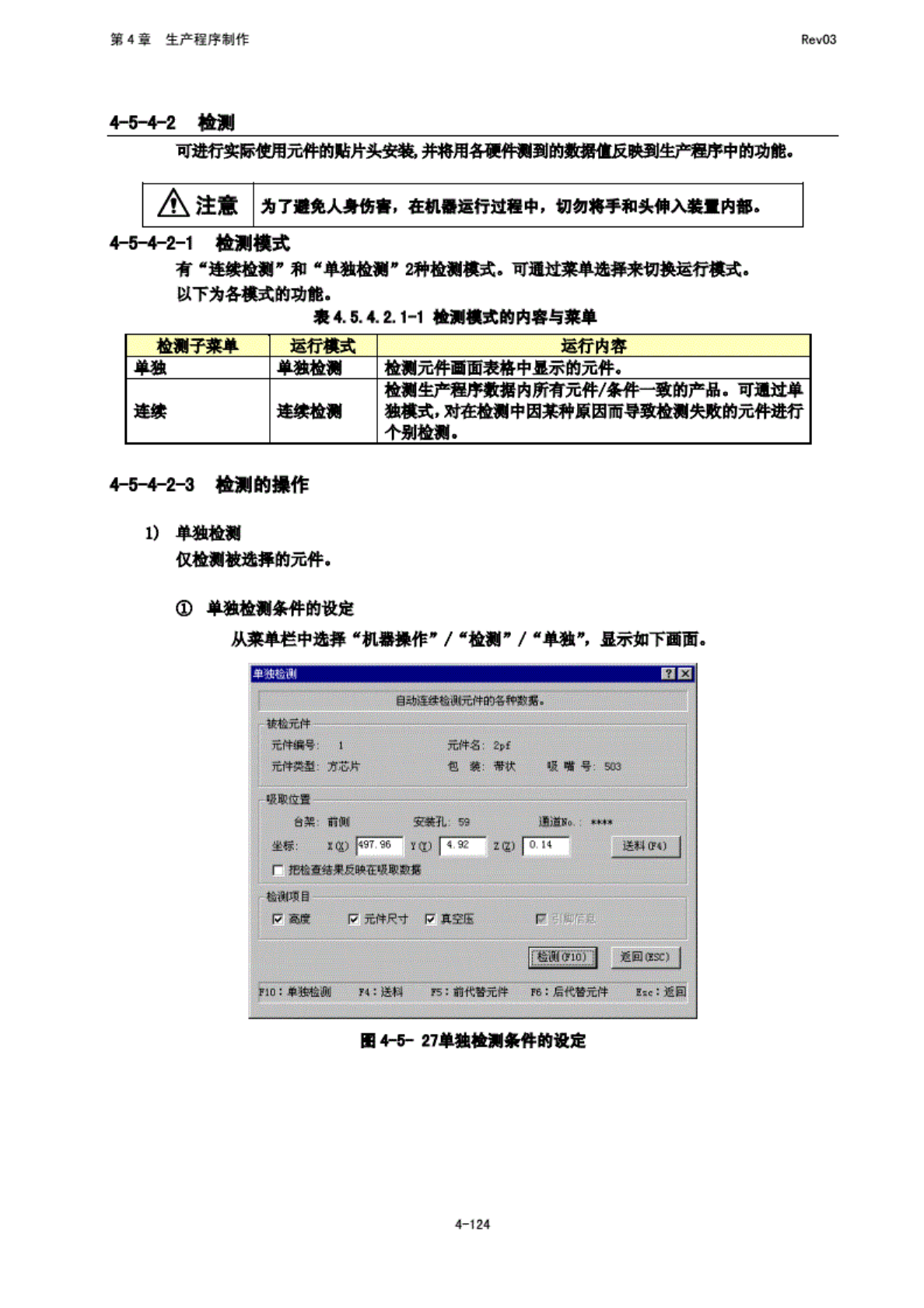 第 4 章 生产程 序制作 Rev03 可进行 实际使 用元件 的贴 片头蟠 井聘用 铜四制 到的数 据值反 映到生 产程序 中的功 能. 出注意 为了 避先 人身 佛事, 在机廉 运行过 程中, 切剪将 手和入 伸入装 ,内 部, 422-1 检 舞模式 有 ,连 续榴 T 和 北 单独检 1T 2 种检 H 模式. 可通过 莱单选 择来切 换运行 模式. 以 下为各 模式的 功能. *4. 5,4. 2. 1-1 检寞 模式 的内容…