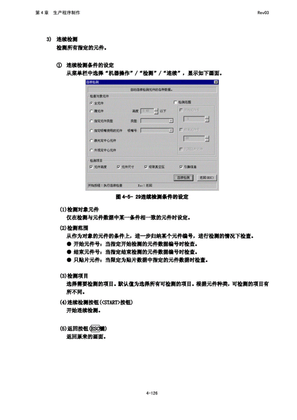 第 4 章 生产程 序制作 Rev03 开始 建续检 蔼后, 显 示在检 31 后事 I 何处理 尺寸在 5 以下 的元件 的选择 画面. 图 4-A 30 元件返 还询问 ・每 次度弃 元件进 行每次 指定的 废弃. 每 次归还 元 件返述 原来的 位置. 每 次请问 每 1 次检 器结束 后都对 1m 以下 的元件 进行箍 认. 连蟒 I 的速 检 丽完所 有在奈 件中指 定的元 件后, 显 示那下 信息. 图 4~5~ 31 …