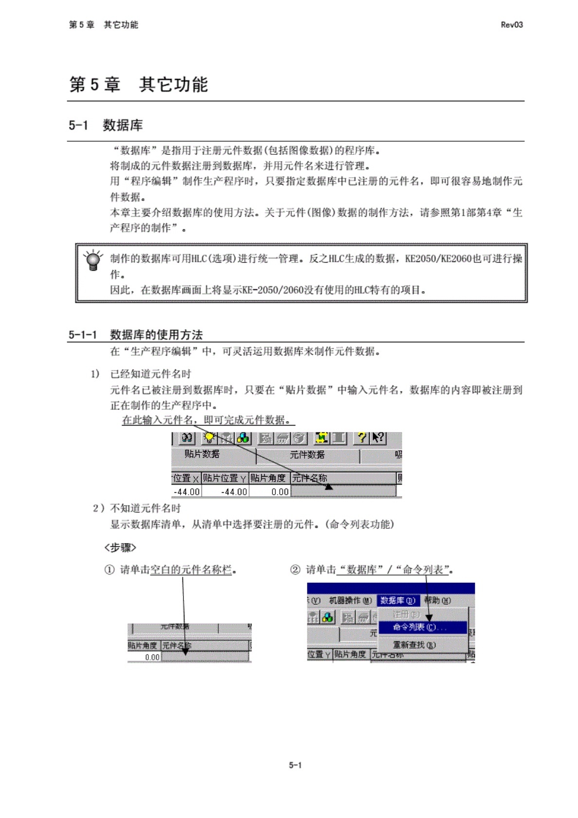 第 5 堂 其 它功能 RfivO3 第 5 章 其 它功能 5-1 数据库 “ 数据库 ”是 指用 子 争 E 册元件 数据 (包 括图像 签据) 的程 序库. 将制成 的元件 数据注 册到数 据库. 井用 元件名 来进行 管理. 用* 程 序编辑 "制作 生产程 序时, 只 要指定 数据阵 中已注 册的九 件名, 即可很 容易地 制作元 件数 据. 本章 i 里介绍 数据库 的使 用方法 . 美 f 元件 (图 像) 数据…