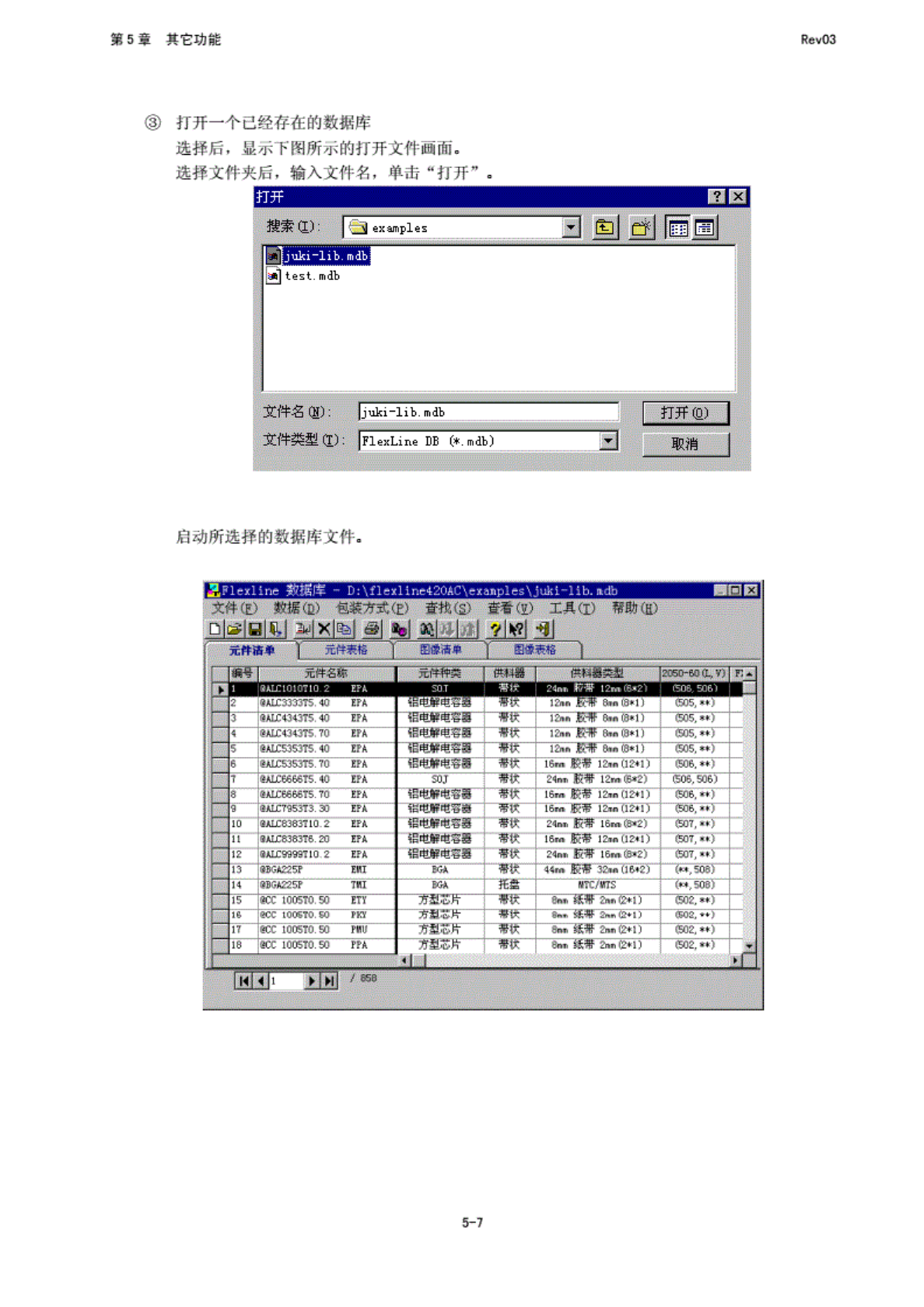 第 5 童 其 它功能 RfivO3 打开一 个已签 存在的 数据库 选择后 、 显 示下图 所示的 打开文 件曲面 . 选 择文件 夹后, 输入文 件名, 单击 “打 开"。 启动 所选择 的数据 库文件 . 文件 JE) 曼据① ) 包 装方式 化) 查 找出) 查看切 工具⑴ 帮助⑥ 口国后 网 f 刈 府 副 勾 叫 1 沏 切刚 JJ 元件 蔺单 J 范件 表他 翻 二品 像清单 T 图像 表格 1 匚 西 元 件…