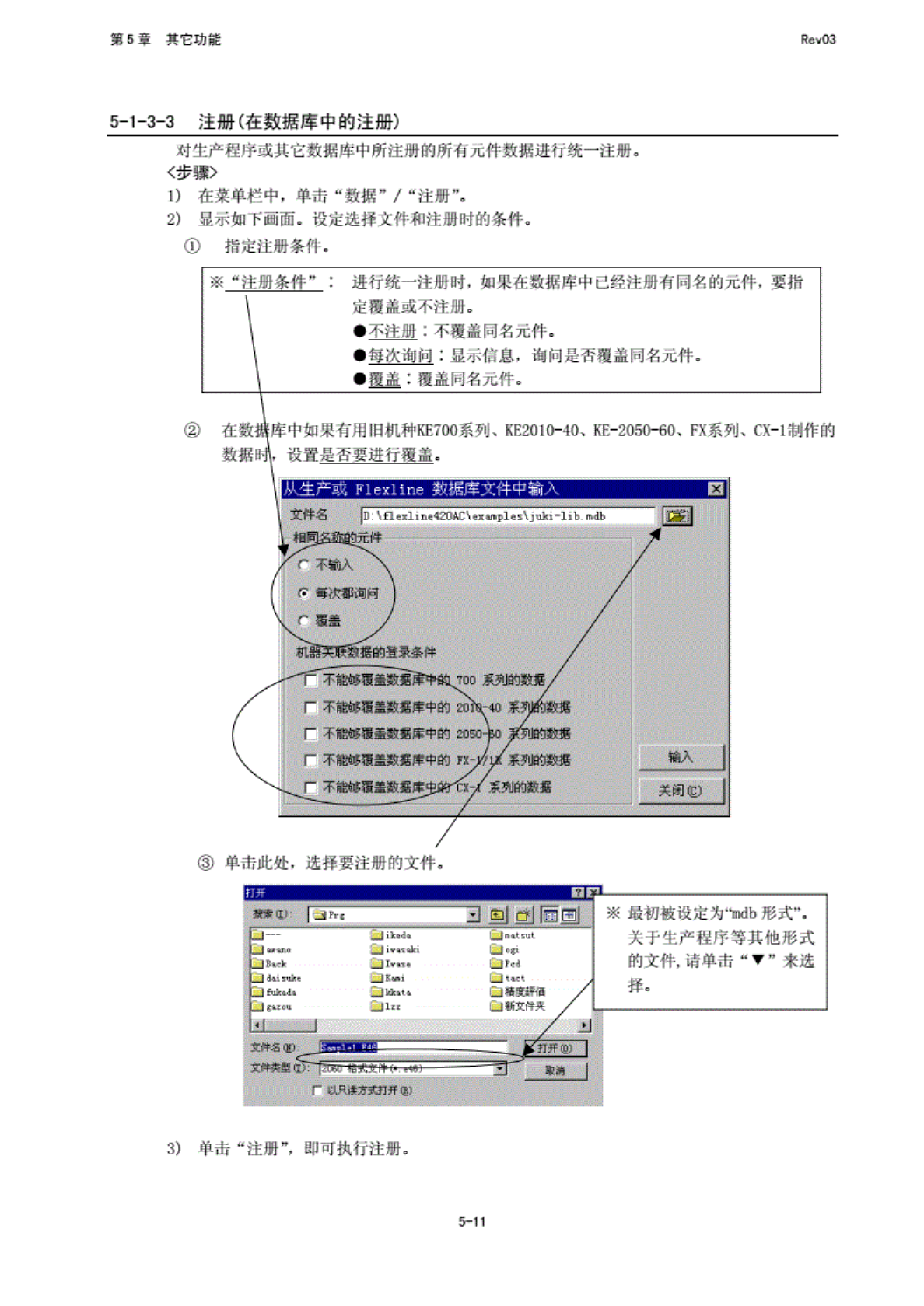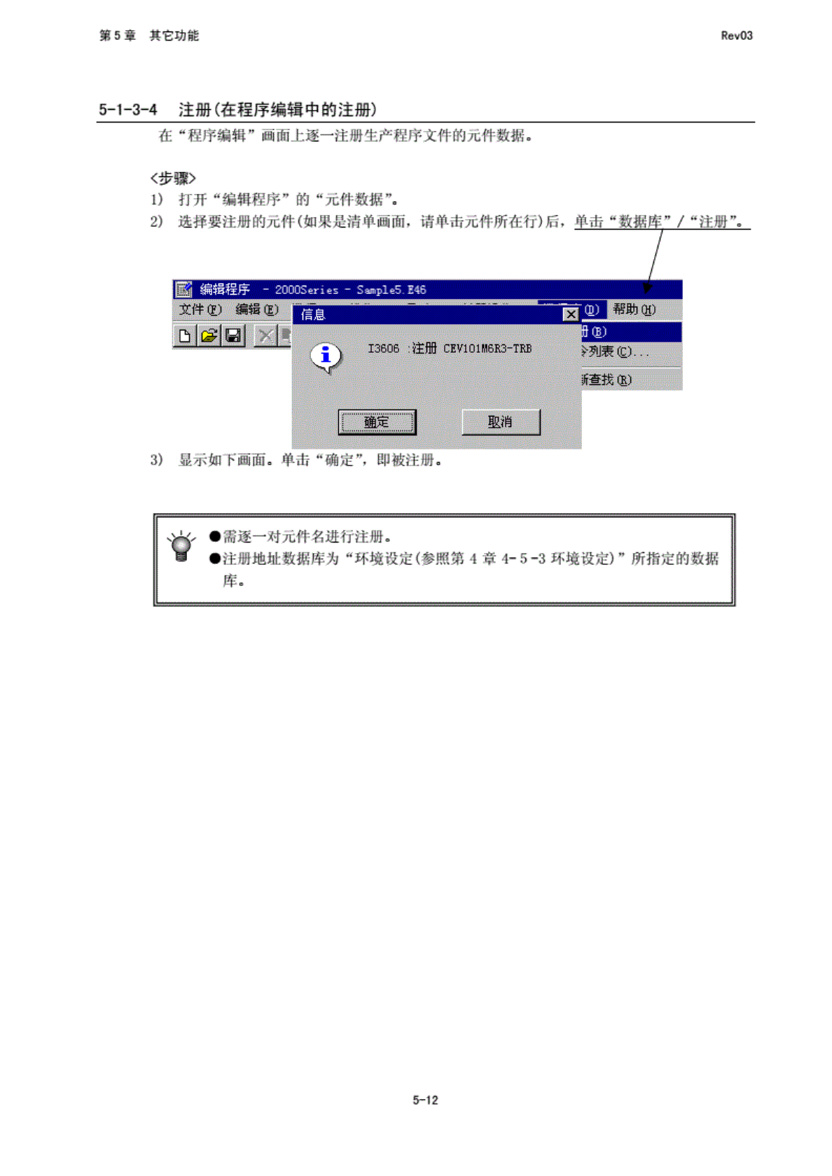 第 5 堂 其 它功能 RfivO3 5-A3-4 注册 (在 程序编 辑中的 注册) 在 “程序 编辑” 画面 上逐一 注册生 产程序 ;文件 的元件 数据. 步骤》 1) 打开 “编辑 程序” 的 “元件 数据工 2) 选择 要注册 的元件 (如果 是清单 画面, 请单击 私排所 在行) 后, 中一 “教要 注… / “库则 二 3) 显 示如下 画面. 单击 “确 定”, 即被注 :册. 需 逐一时 JL 传名 进行 注册. …
