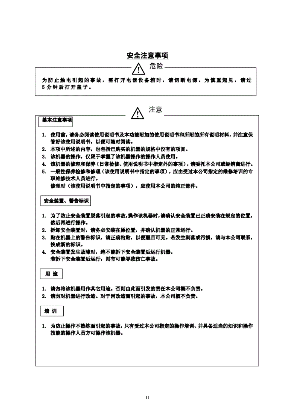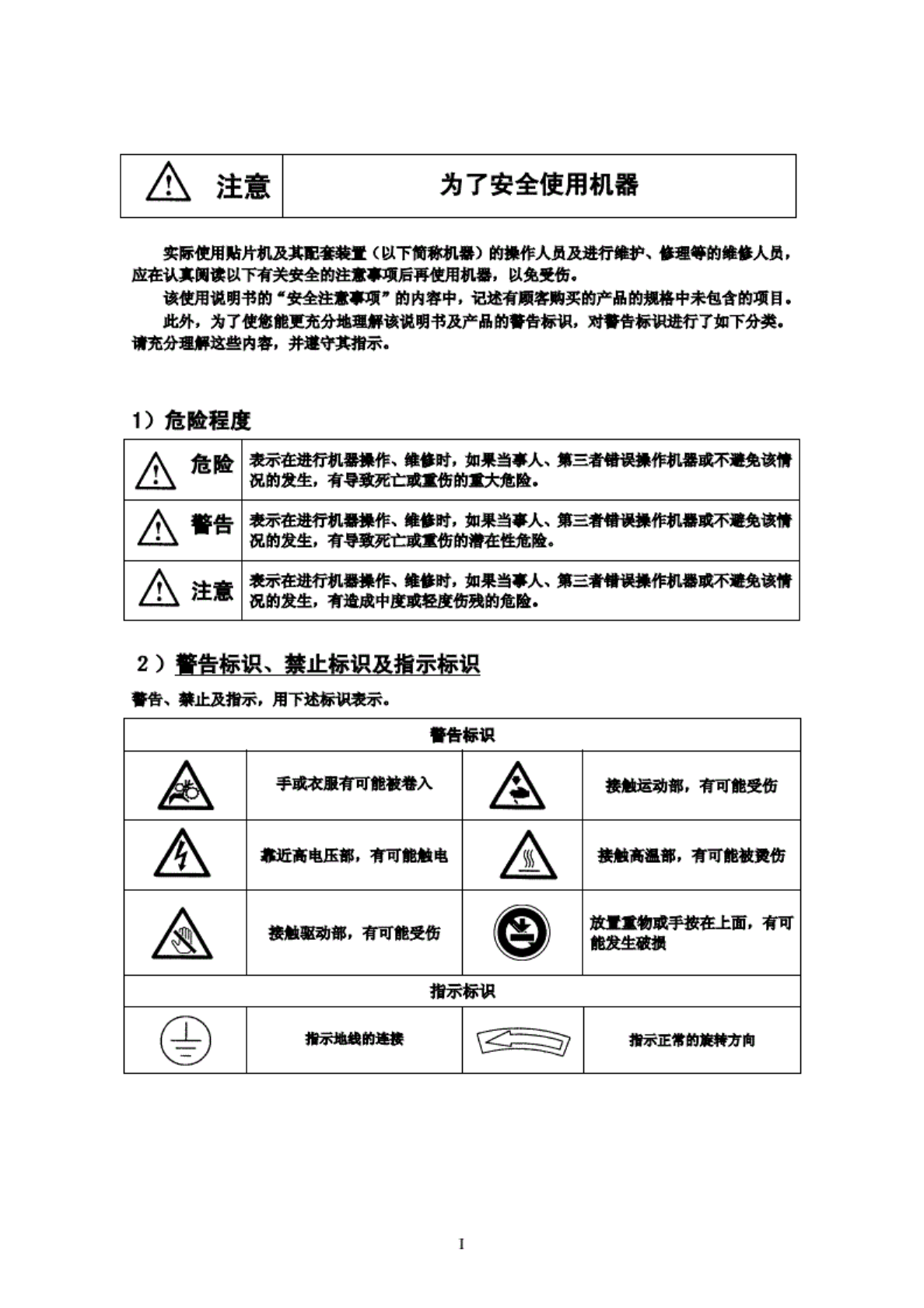 A 注意 为了 安全使 用机器 实际 使用贴 片机显 其配套 装置 ( BI 下值称 机器) 的操作 人员 及进行 维护、 修理等 的跳修 人员, 应 在认真 阅球以 下有美 安全的 注意事 项后再 使用 机器, 以免 受俳. 该使 用说明 书的工 安 全注意 MT 的内 容中, 记述有 原客购 买的产 品的损 格中未 包含的 项目. 此外, 为了使 您能更 充分地 理解 该说 明书及 产品的 赠标 识, 对警 告标 承进行 了如下 分…