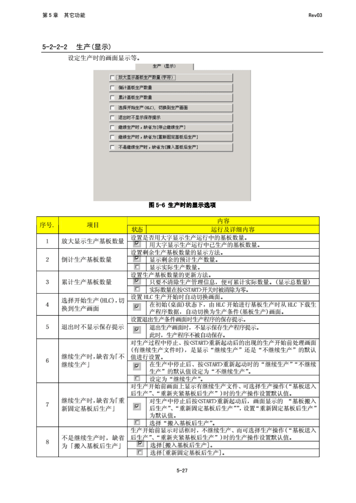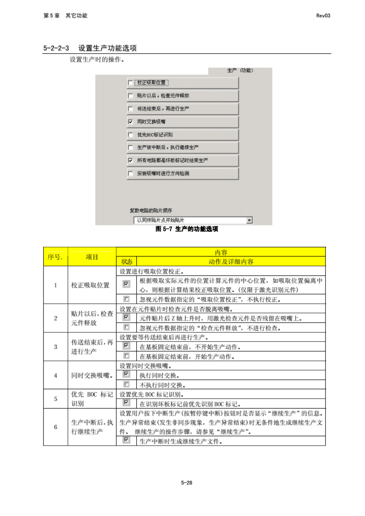 第 5 至 其它 :功能 RfivO3 5-2-2-3 设置 生产功 能选项 设置生 产时的 操作。 生产 励能) 厂: 这正败 跟住置 3 r 贴片 目 后, 检餐元 件释放 r 传送 结束后 1 再进 行生产 9 同时 吸嘴 r 忧先 的匚 标 记识别 । r 生产被 中断后 ,执 行继 续生产 歹 所有电 路都是 坏顿标 记时结 束生产 r 安装 怩曜时 进行方 向检胞 裁电 路的贴 片顺序 I 以 同样贴 片点 开撷 6 片 H…