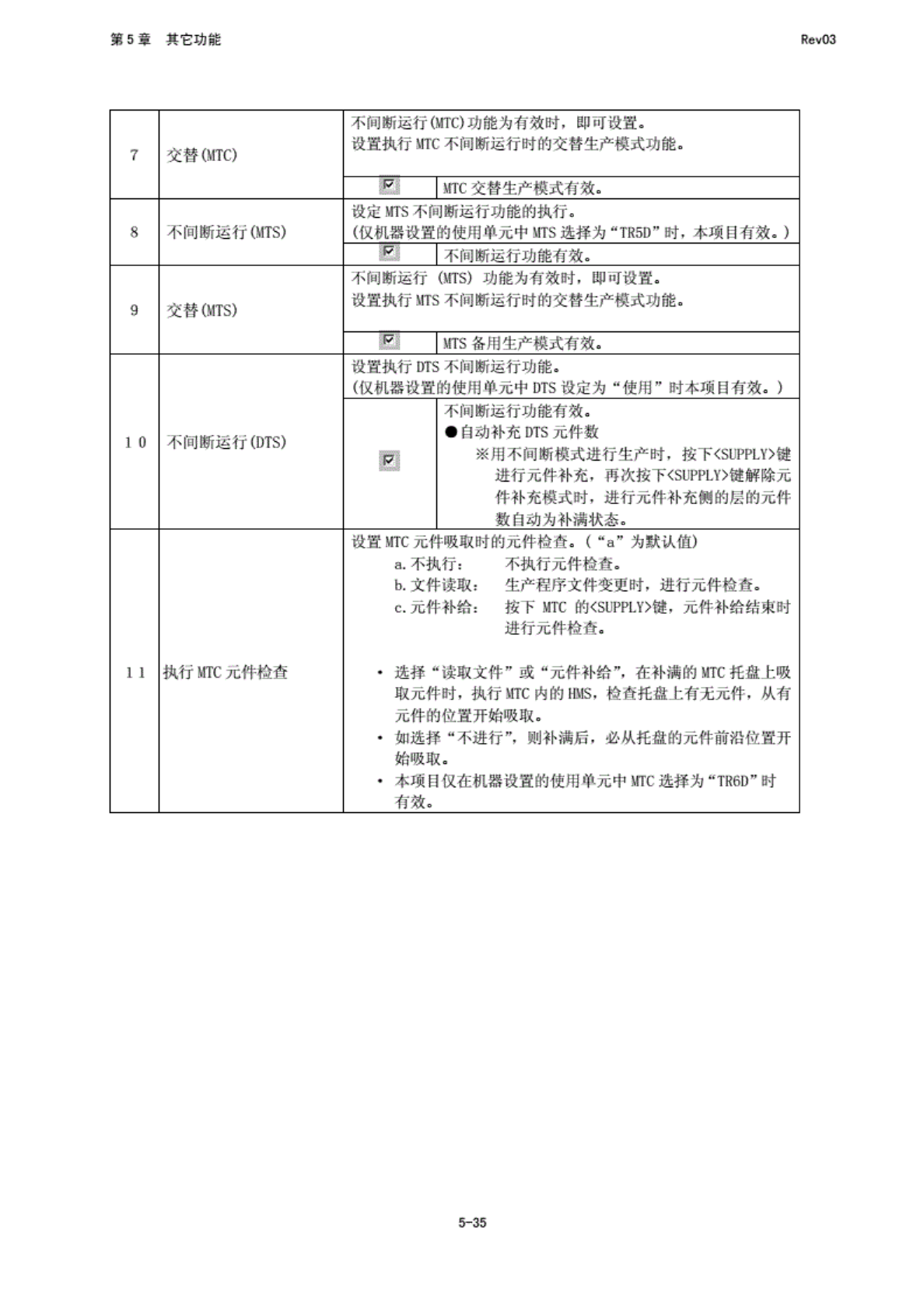 第 5 堂 其 它功能 RfivO3 7 交替 (MTC) 不间 那运行 M0 功能为 有效六 , 即可 i 殳置. 设 置执行 MTC 不间断 运行 时的交 臂生产 模式功 能. 病。 交替生 产模式 有效. 8 不同 断运行 (MS) 设定 NTS 不切断 运行5 能的执 n. 《仅机 器设置 的使用 电元中 MT& 选择为 “TR5 【广小 本项 I I 有效. ) 耀 不间 断迄" 功能有 效. 9 交替 (H…