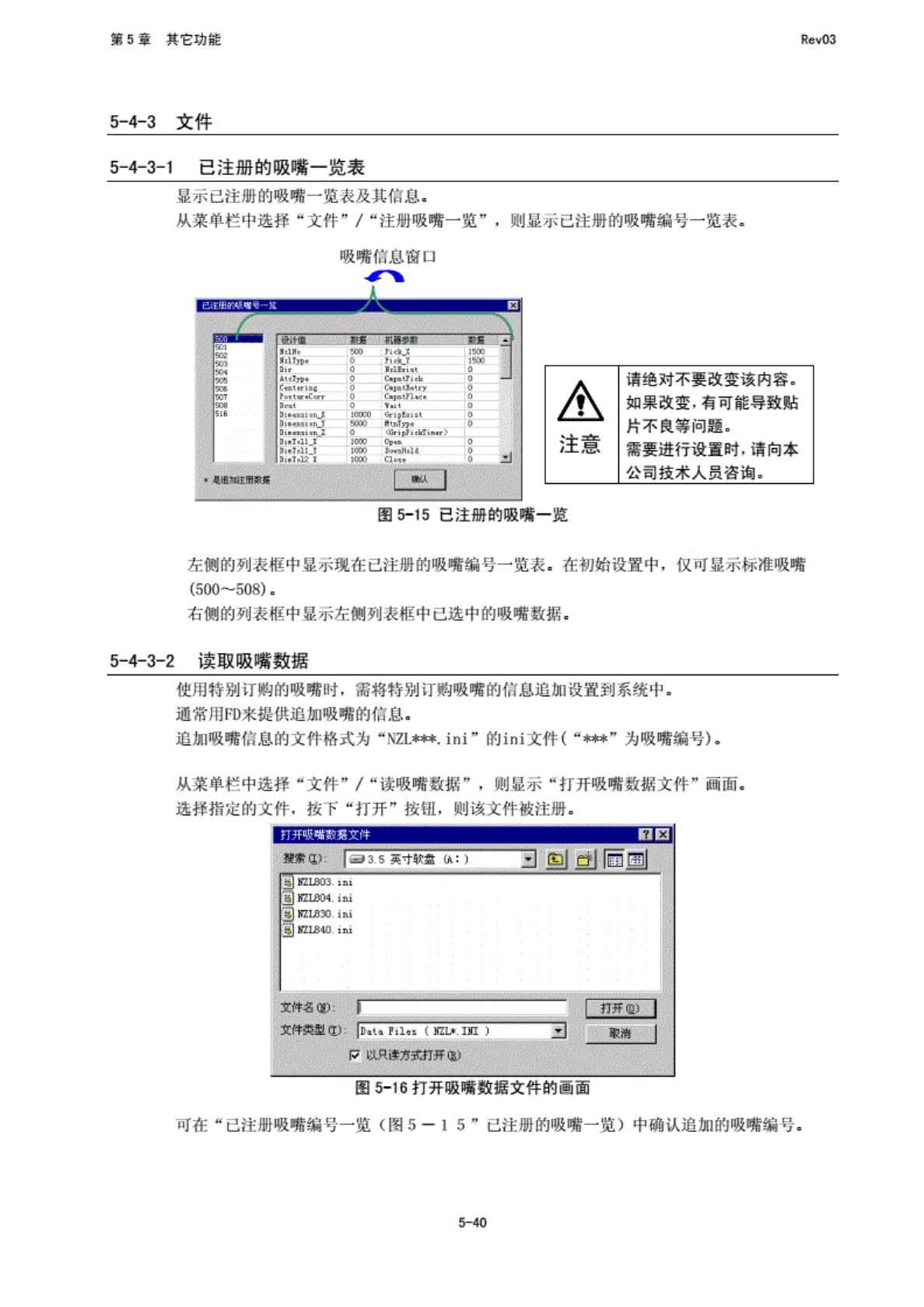 第 5 堂 其 它功能 RfivO3 3HL 源 ini 凰施 LS03. 画 KEL0O4. 匐 施 L84O. 3 倒 斗局国 打开嗫 时散亮 文伸 之伸 名骄) : I 文件 金型 m: jim ?!1 i'ffiLf.i)n: j V 匠 城只 需方 式打 冷第1 打开通 | 密者 | 使 I 门特 那 『物 的吸 嘴时 ,需 将特别 订购 吸嘴的 辐息追 加设置 到系统 H 1 . 通常用 FD 来提 供追加 吸嘴…