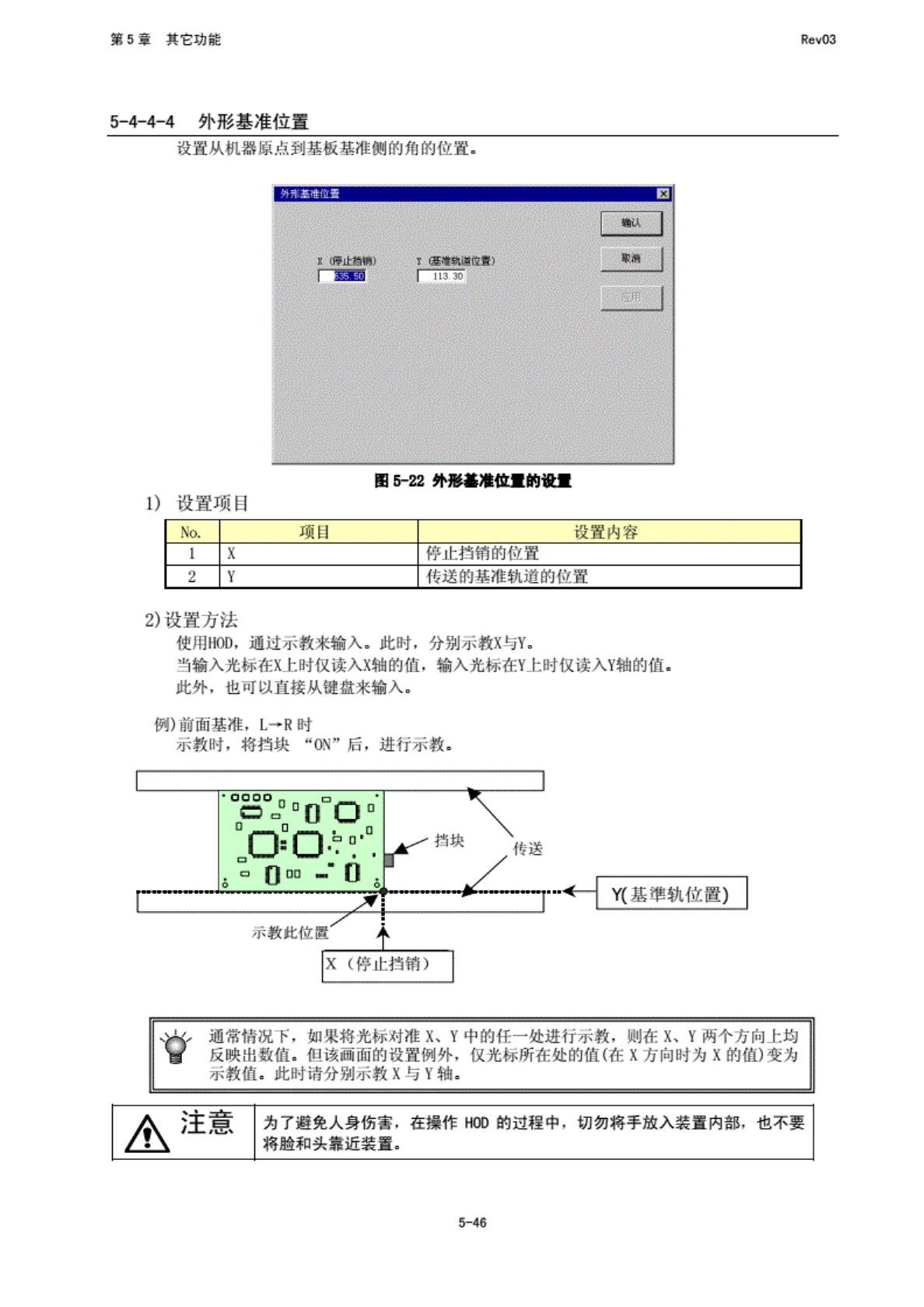 第 5 堂 其 它功能 RfivO3 5-4-4-4 班形基 准位置 一置 从机 器原点 到基板 基准恻 的布的 位置. 图 卜 22 外形 基拳位 的设 ・ 1) 设 置项目 No. 项 H 设 置内容 1 X 停 止挡销 的位置 2 Y 传送伯 盛 准轨道 的位置 2) 设 置方法 使用 HOD, 通过 示教来 输入. 此时, 分别示 州与九 当输 入光 m 在 X 上时 仅读入 X 轴的 值, 输入光 标在V I: 时仅读 入 …
