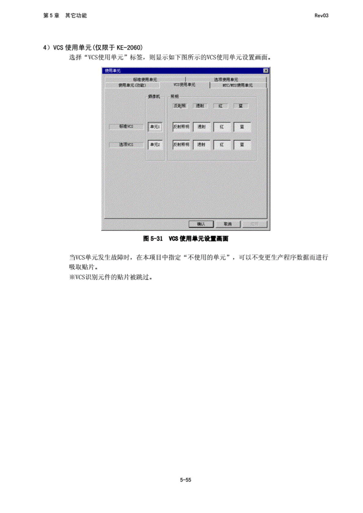 第 5 堂 其 它功能 RfivO3 使用 单元 4) VCS 使 用单元 (仅 限于 KE-2060) 选择 “VCS 使用 单元” 标签 「 则显示 如下图 所示的 MS 使用单 人设置 画面. 国 5T1 VDS 使用 单元设 当 yCS 单元发 小故障 肿, 在本项 目中 指定 “不 便用的 单元" .可以 不变史 生产 程序数 掷而 进行 吸取 贴片. ※般 识别 元件 的贴 片被 跳过. - 5-55