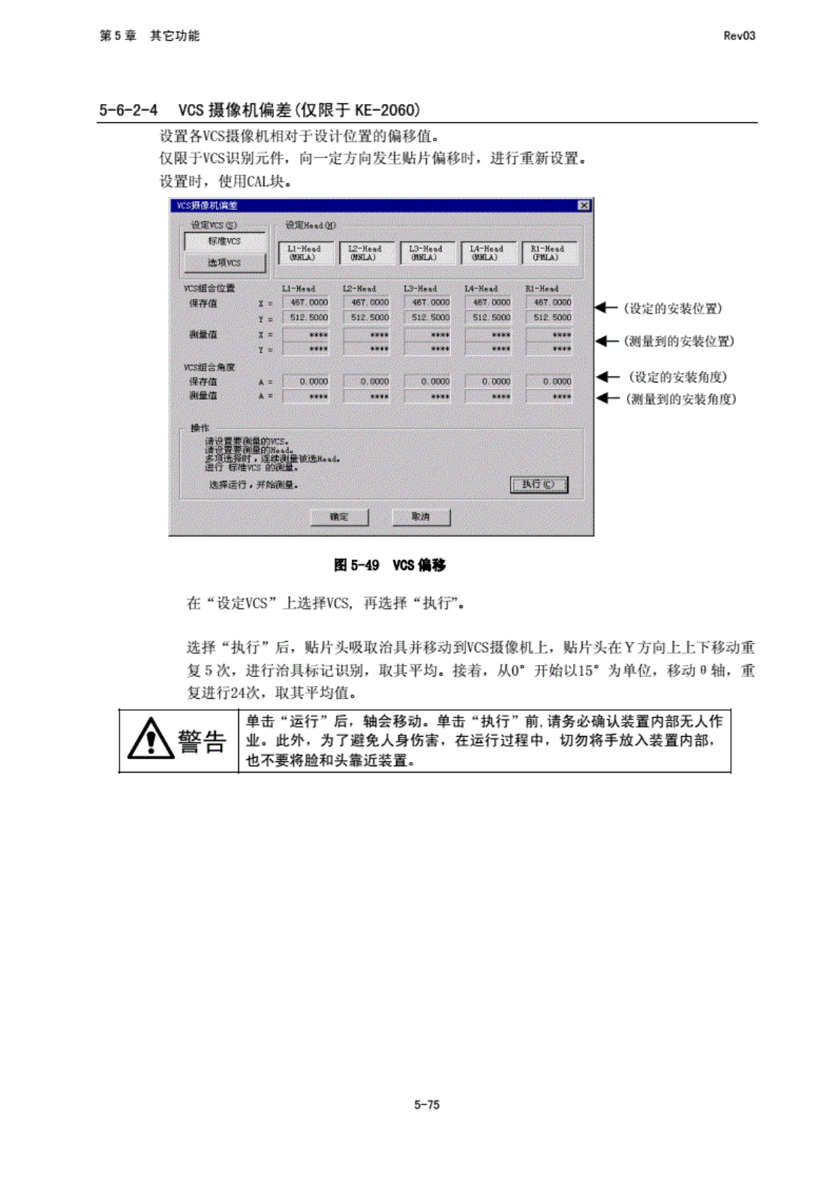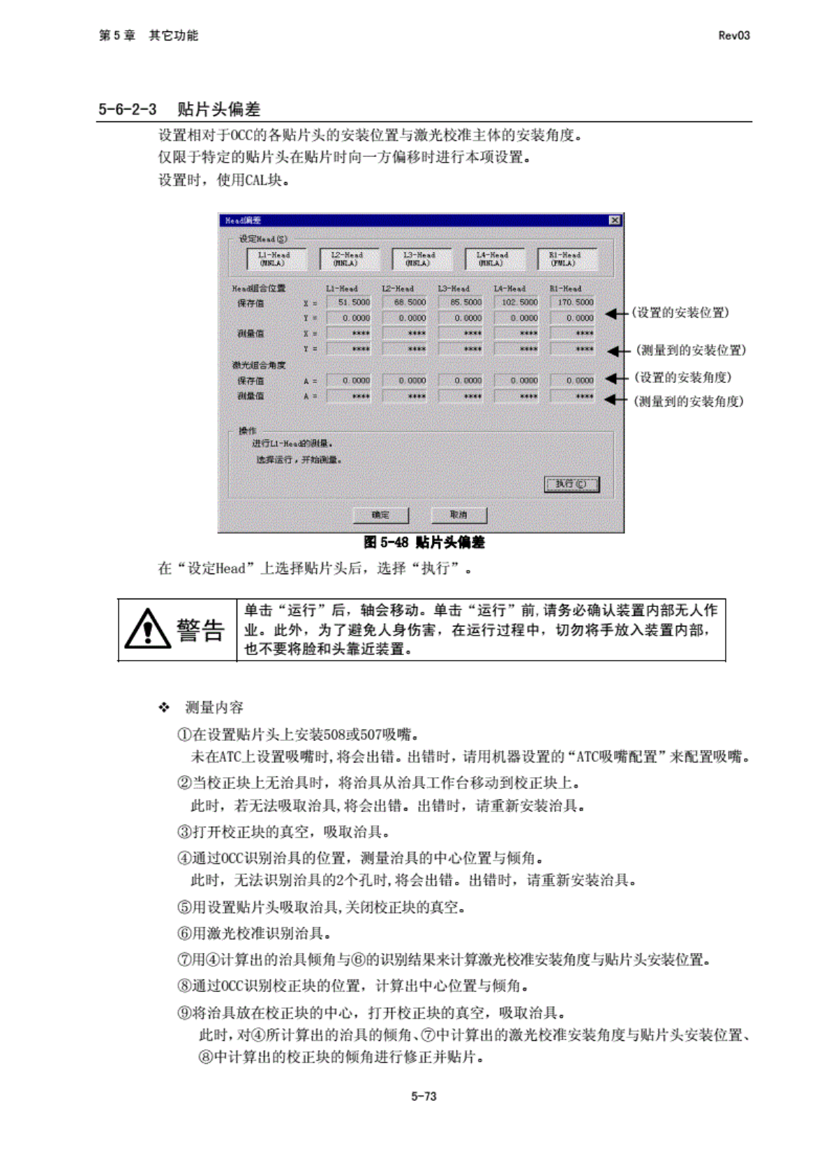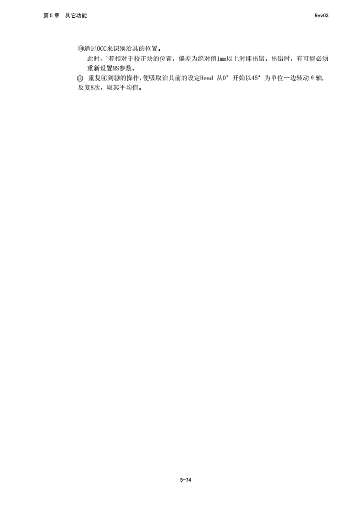 第 5 堂 其 它功能 RfivO3 OCC 来识别 治具的 位置. 此时 ,’若 相对 F 校 正跳的 位置, 偏差为 绝对值 1 加以 上时即 出错. 出 错肘, 有可 能必须 重 新设置 MS 参数。 © 重 复④到 (的 操作 ,使 吸取 治具前 的设定 Head 从 0" 开始以 450 为 单位一 边转动 8 轴, 反 复说几 取其平 均值. 5-74