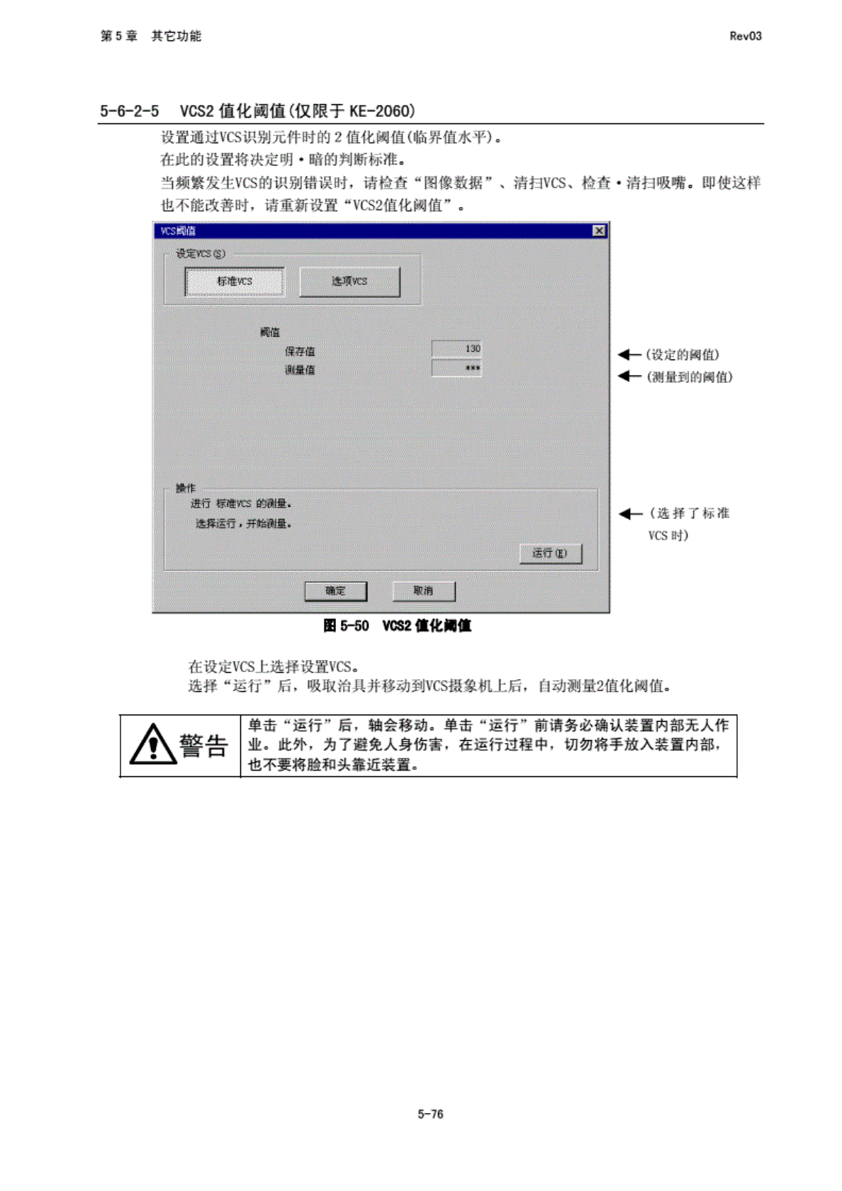 第 5 堂 其 它功能 RfivO3 5 一七2- 5 VCS2 值 化阈值 (仅 限于 KE-2060) 注 置通过 VCS 识别 死件 时的 2 值 化阈值 (临 界值水 平) . 花此的 设置将 决定明 • 此 的判断 标准二 当频 繁发生 VCS 的识 别错 误时, 请检直 “图像 数据” 、 清 EVCS、 检查 ,清也 吸嘴. 即使这 样 也 不能改 善时, 请重 新设置 “VCS2 值 化阈值 "二 B5-50 …