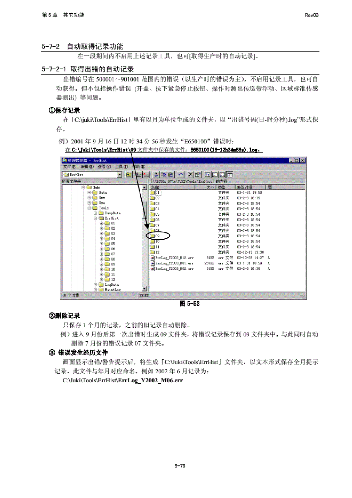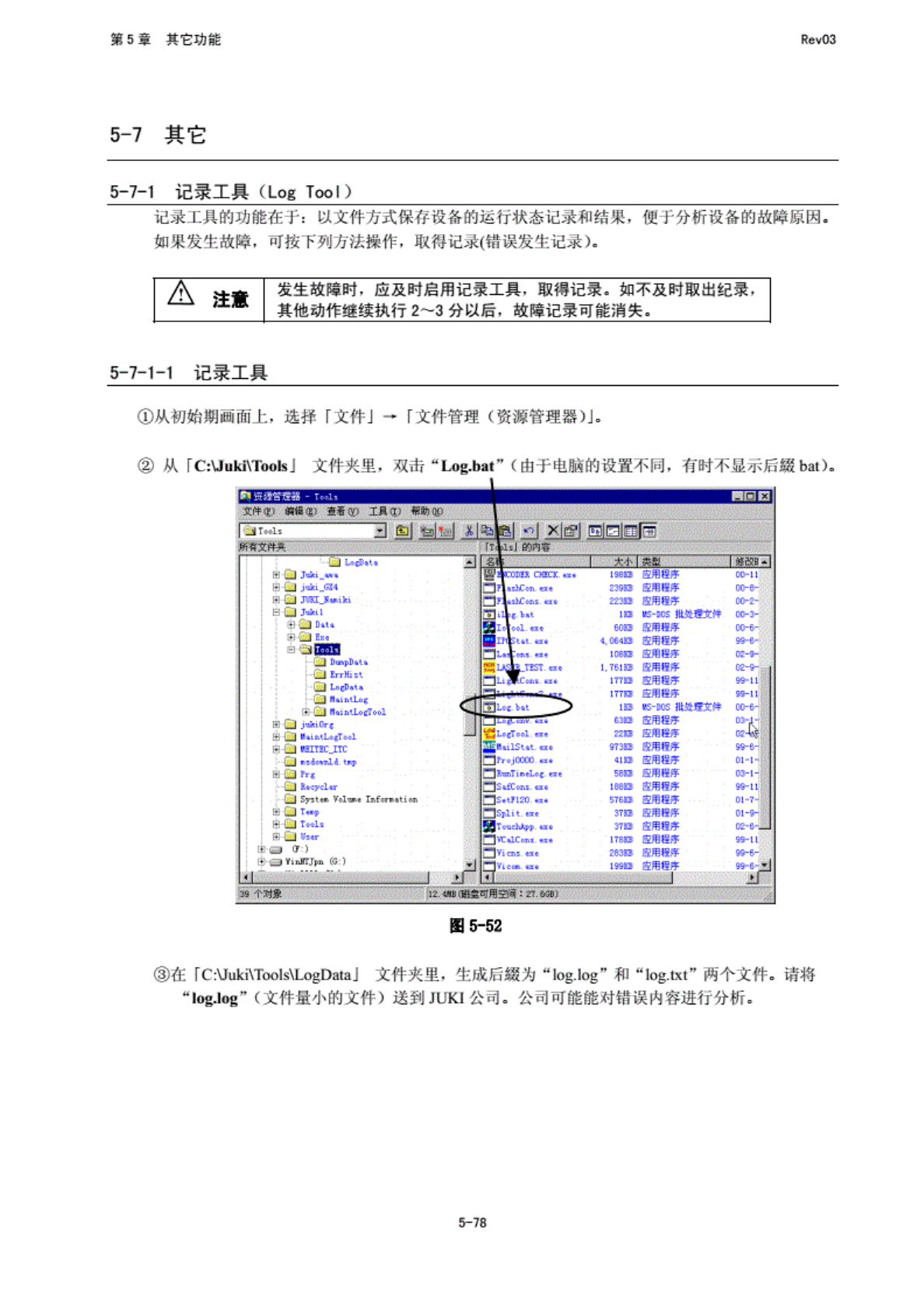第 5 堂 其 它功能 RfivO3 5-7 其它 5-7-1 记录 工具 (Log Too I ) 记一 口具的 功能在 以上 件方 式年 疗设保 存运 行状 强行 整利 结果, 使卜分 析设备 的故障 的故. 如果发 生故障 ,可按 下列方 法 操作, 取 得记录 (错 误发生 记杂久 A 注意 发生故 障时. 应 及时启 用记录 工具. 取得 记录. 如不及 时取出 纪录, 其他 动作继 爆执行 213 分 以后, 故障记 录可能…