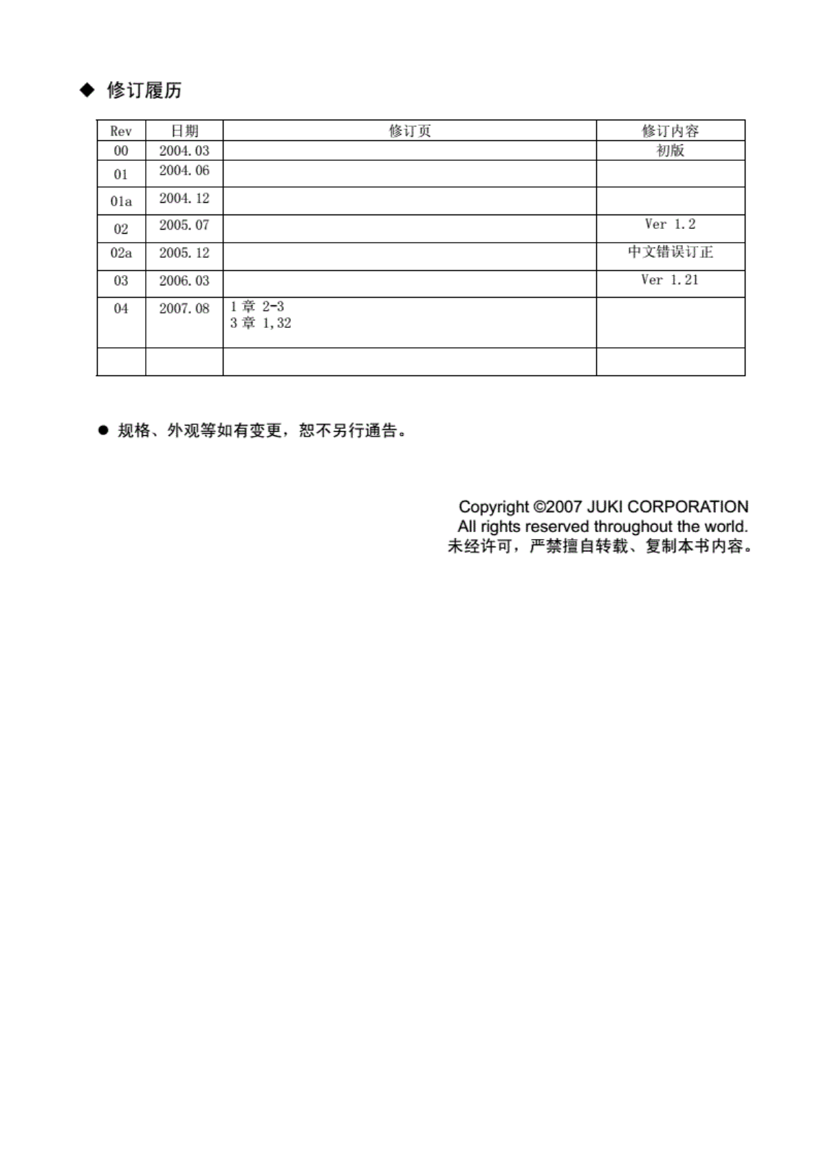 修 订履历 Rev 日期 修订页 修 订内容 00 2004. 03 初版 01 2004. 06 01a 2004. 12 02 2005. 07 Ver 1.2 02a 2005. 12 中文错 误订正 03 2006. 03 Ver 1.21 04 2007. 08 1 章 2-3 3 旨 1 p 32 • 规格、 外观 等如有 变更, 恕不另 行通告 a Copyright ©2007 JUKI CORPORATION All …