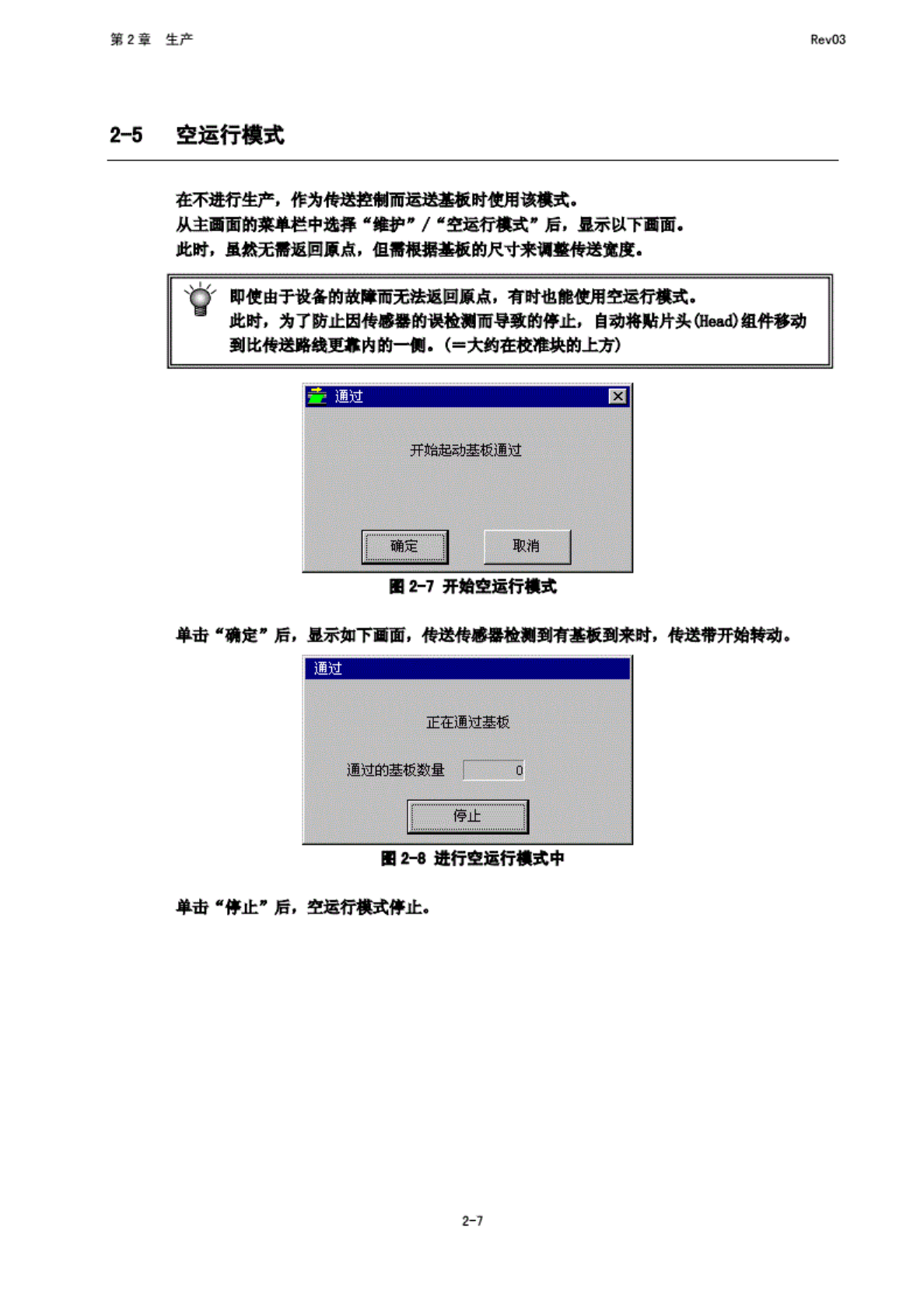 第 2 章 生产 Rev03 2-5 空运 行模式 在 不进行 生产, 作为 传送控 制而』 基板时 使用该 模式. 从主 西面的 菜单栏 中选择 "维 护" / "空 运行 模式* 后, 显示 以下画 面. 此时, 虽 然无需 返回原 点, 但需 根据基 板的尺 寸来调 整传送 觉度. 0 即使由 于设备 的故障 而无法 返回原 点, 有时也 能使用 空运行 模式. 此时, 为了防 止因传 感器的 谢好 …