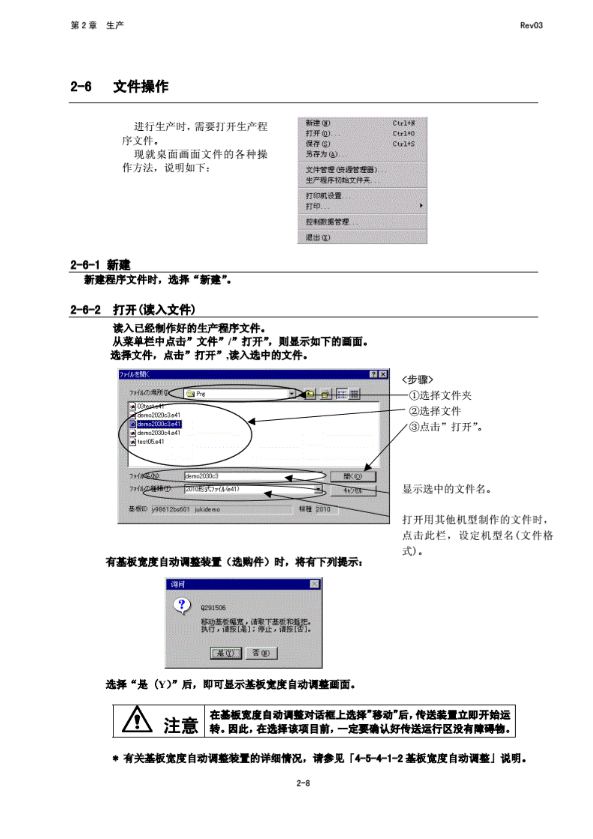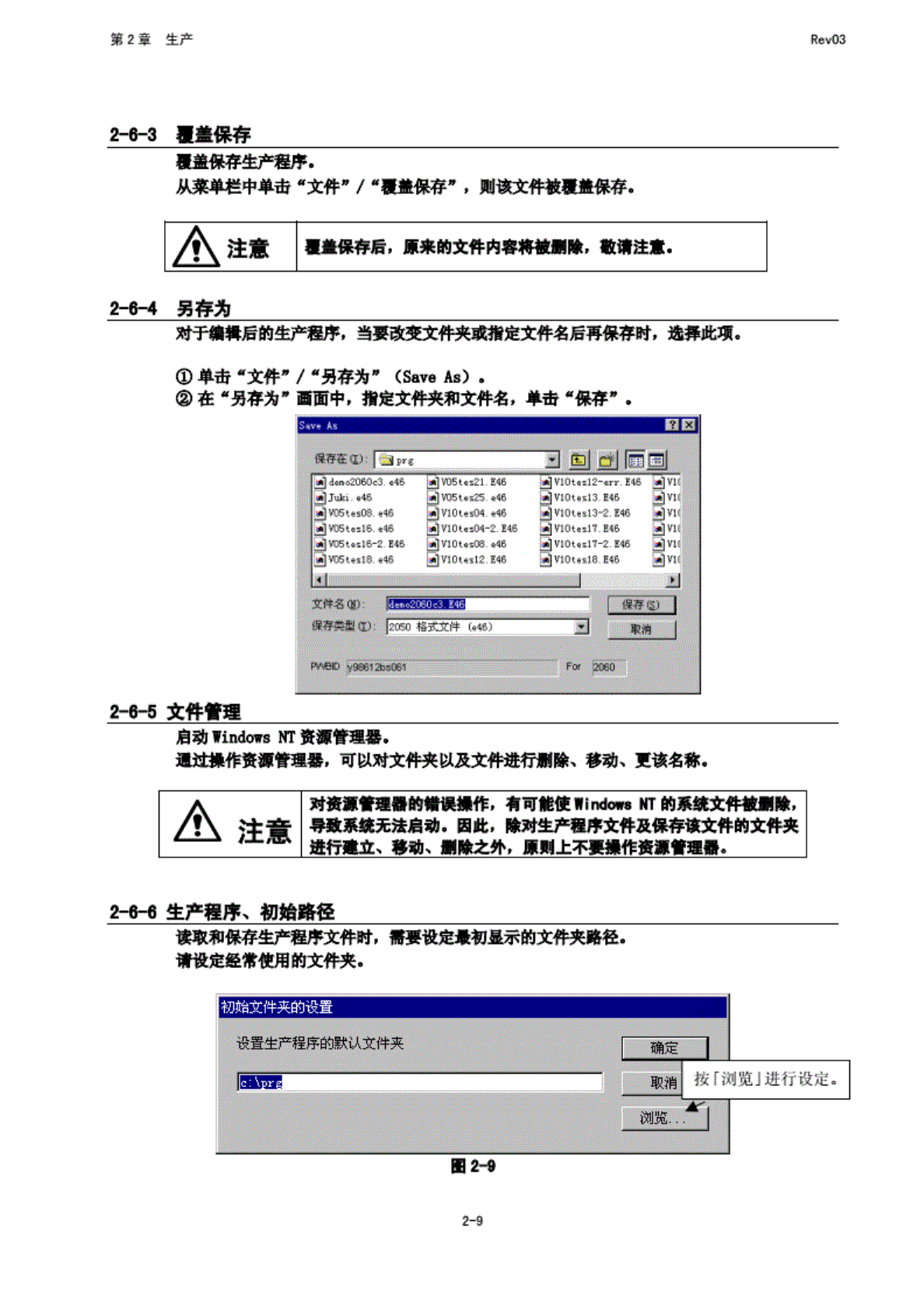 第 2 章 生产 Rev03 2-6-3 覆 基保存 从 菜单栏 中单击 .文铲 L 覆 盖保铲 , 则读文 件被雇 费保房 注意 存后, 原来 的文件 内容将 4UK 除, V [请注 意・ 2-84 另存为 对于 编辑后 的生产 程序, 当 要改变 文件夹 或指定 文件名 后再保 存时, 选择 此项. 力 王府名 iF 保存集 契①: 辰 -落事 军 T丽 FW3D y 湖 独加 2™8"5 文 件管理 只州峻 060c3…