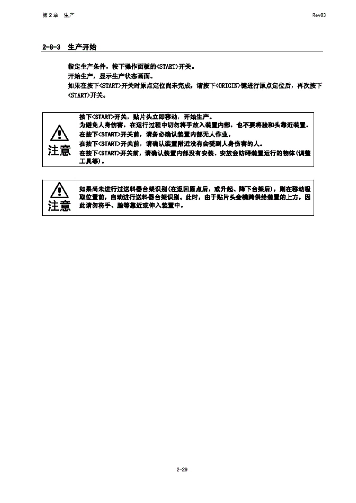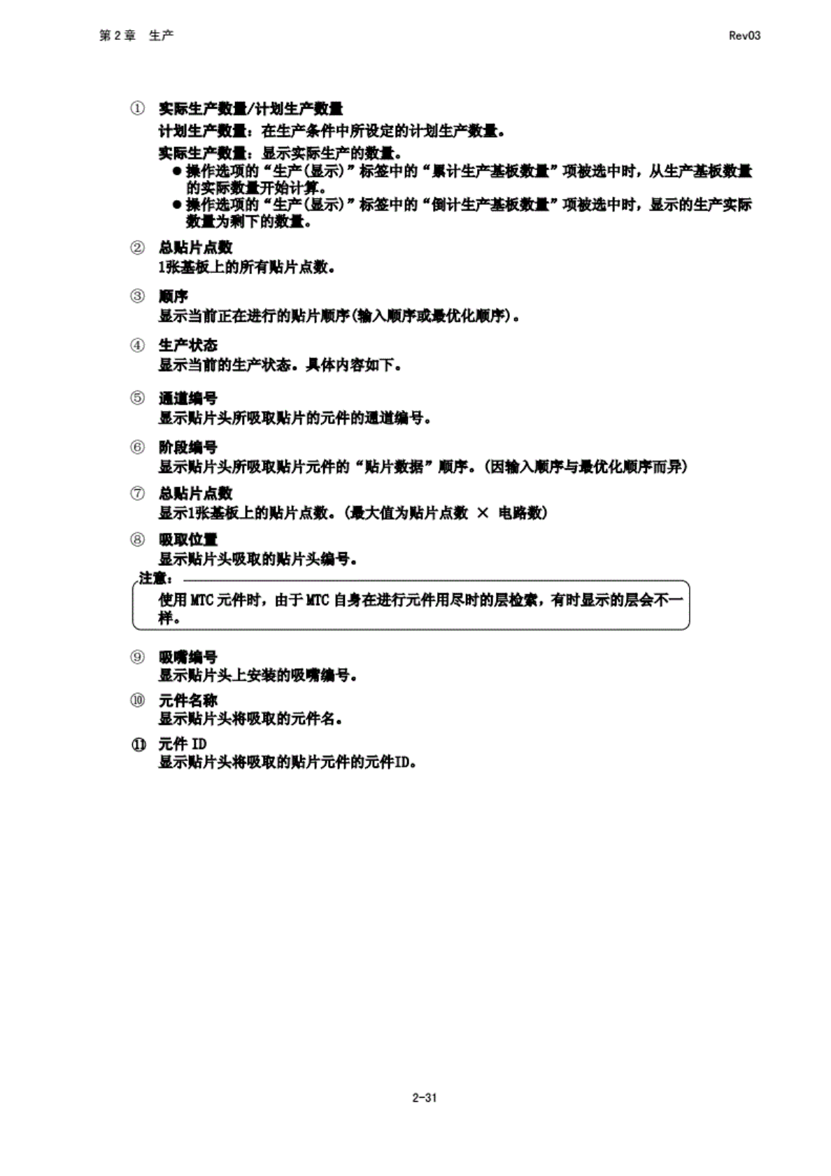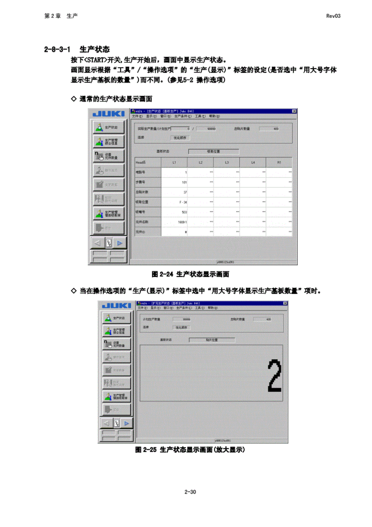 第 2 荤 生产 Rev03 2-8-3-1 生 产状态 按下 《 START) 开关 ,生 产开 始后, 画面中 显 示生产 状态。 画面显 示根据 "工 具* / "操 作选 项特的 以生产 (显 示) 总标签 的设定 (是 否途中 回用大 号字体 显 示生产 基板 的数 量耳) 而不同 . (参见 62 操作 选项 0 遗常 的生产 状态显 示国面 图 2-24 生产 状态显 示画面 O 当 在操作 选项的 “…