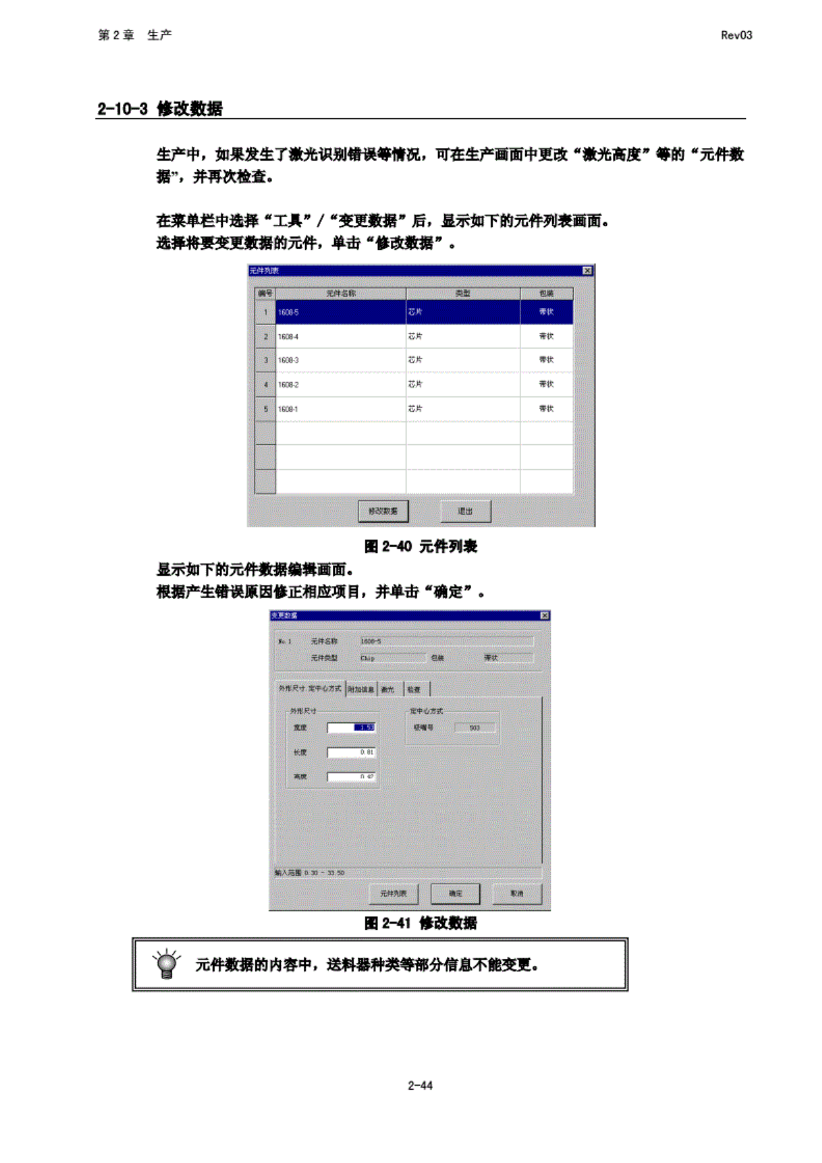 第 2 章 生产 Rev03 2-10-3 修改 数据 生 产中, 如 果重生 了激光 班别错 黄好情 况, 可在生 产画面 中更改 .激光 ifif 度 等的 “元 件数 据”, 并再次 检香, 场单栏 中选择 '工 具” / * 变则据 〃 后, 显 示如下 的元件 到衰磁 面. 选界 将要 变更数 据的元 件. 单击 "修改 W . 图 2To 元 件列衰 显 示如下 的元件 数据 编辑洞 面. 根据产 生错误…