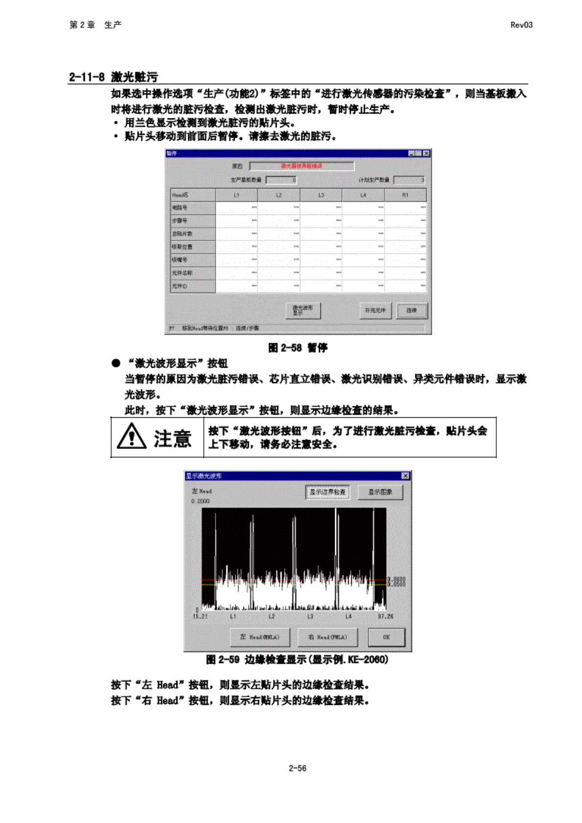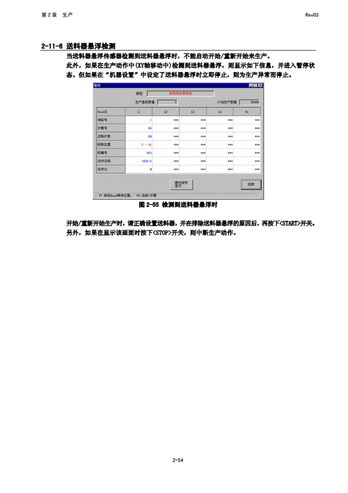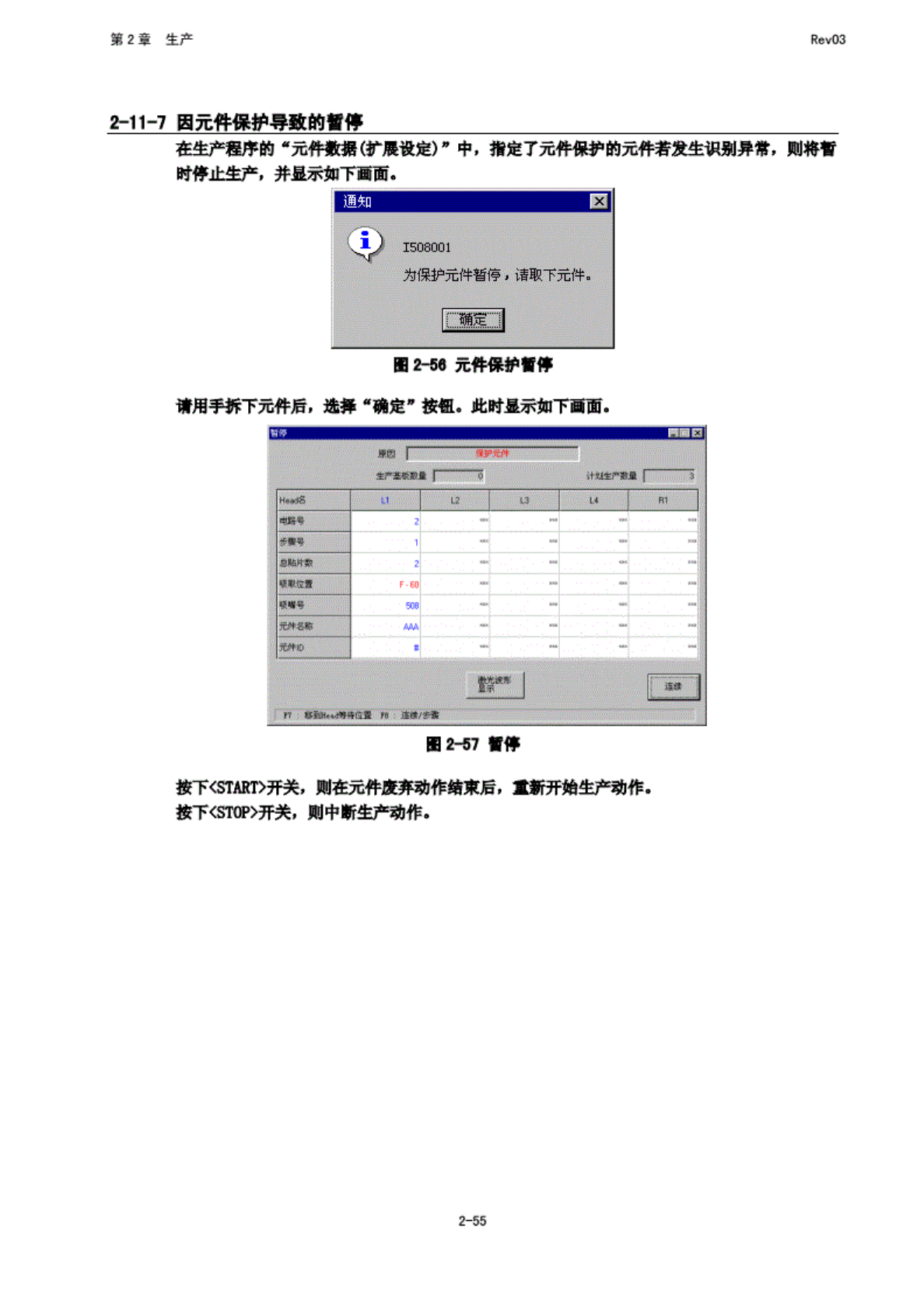第 2 章 生产 Rev03 Z-11-7 因 元件保 护导致 的印停 在生产 程序的 “元 件数据 (T 屣 段定了 中, 指定了 元件保 护的元 件若袁 生退期 异常, 则 HT 府停止 生产, 并显 示粼下 画面. ffl2-5fl 元件保 护曾停 试 用手拆 下元 件后, 选择 *确 定” 按钮* 此 晡显示 频下 画面. B0 2-57 讨停 按下 <STABT> 开关, 则在元 件废弃 动作结 束后, 重新开 始生产 动作.…