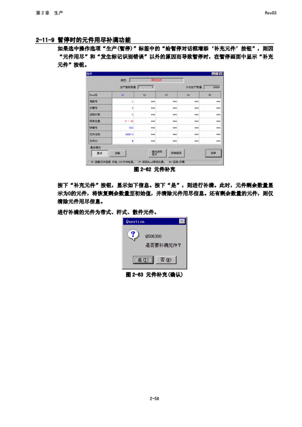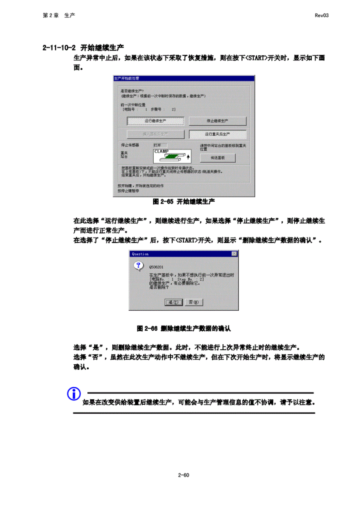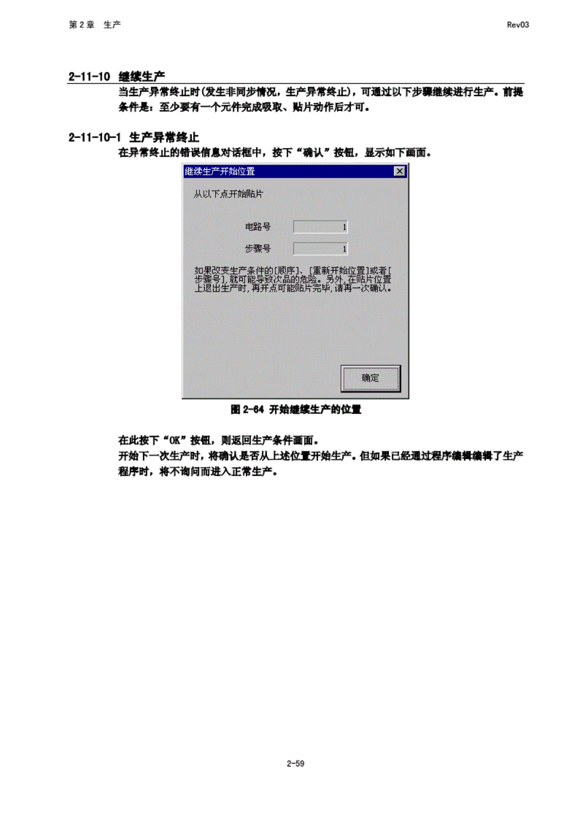 第 2 章 生产 Rev03 2-11-10 继 续生产 当生 产异常 终止时 (发生 非同步 情况, 生产 异常终 止), 可 通过以 下罗联 续进行 生产. 前提 条 件是* 至少 要有 T 元 件完成 吸取、 贴片动 作后才 可. 2-11-10-1 生产异 常终止 在异常 终止的 错建信 息对话 框中, 按下 .确认 ”按 钮, 显 示如下 画面. 明 加 64 开始 曲产的 位・ 在此 按下 “0K” 按钮, 则返 回生产 条…
