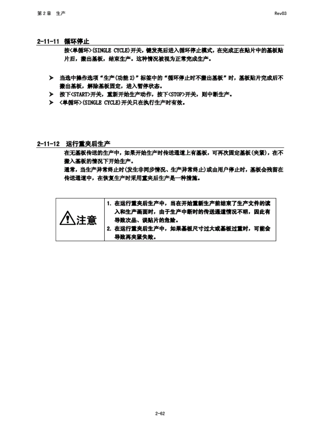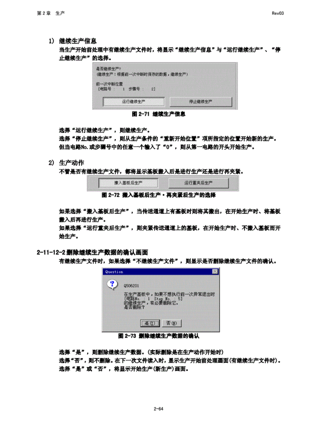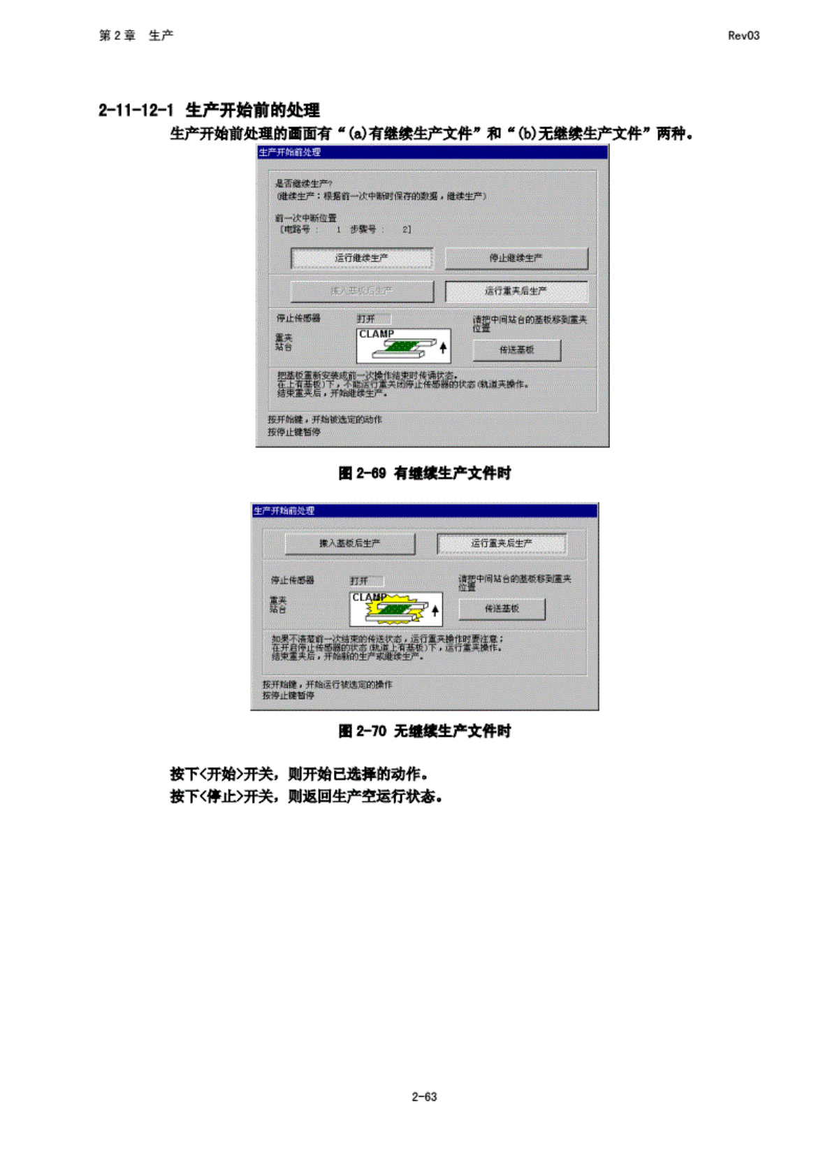 第 2 荤 生产 Rev03 2T1T2-1 生产 开始前 的处理 生产 开始前 处理的 画面有 『出) 有继 续生产 文件即 和 06) 无继 续生产 文件" 两种. 图 2-69 有继 续生产 文件时 图 2-70 无罐 续生产 文件时 按下 《开 始〉 开关, 则 开始已 选择的 动作. 按下 停止》 开关, 则返回 生产空 运行状 态. 2-63