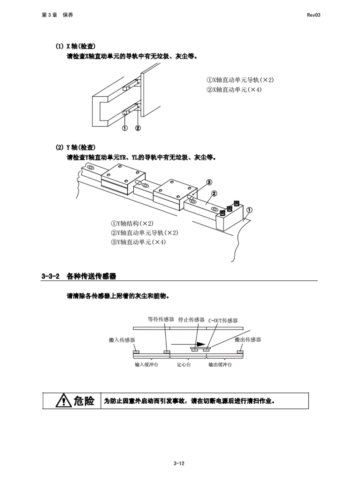 第 3 童 保养 Rev03 请检 故轴 组件与 册单元 (左 右两 处) 的导轨 中有无 垃坡、 安 尘等, 如有, 请进 行清扫 • 如果 擦去 了洞清 脂, 请参照 “3T 加油” • 重 新注入 润滑脂 • 93- 12 3-3 清扫 3-3-1 XY 轴直 动单元 -SHIH X 轴单元 3-11 轴单元