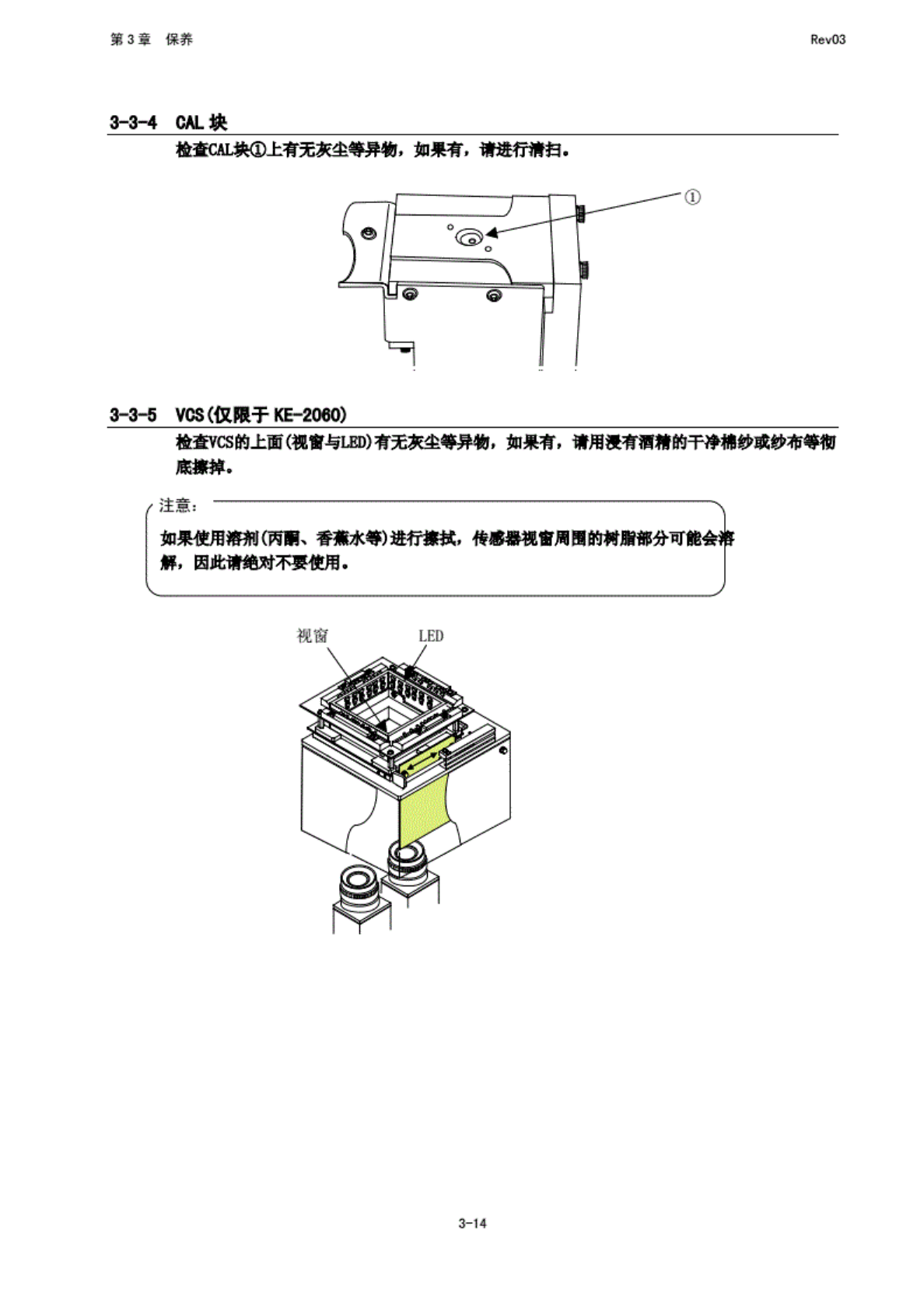 第 3 章 保养 Rev03 3-A4 CAL 挑 检查 CAL 块① 上有无 灰尘等 异物, 如果将 请进行 清扫. M3-5 VCS (仅 限于 KE-20e。} 检查 WS 的上面 《视 窗与 LED) 有无 灰尘等 异物, 切 果有. 瑞用 没有酒 精的干 净捕缴 或梦布 警物 ,注 意: > 如果 使用洛 SK 丙网、 香德 水等) 进行 擦拭, 覆碎幽 盲周国 的相脂 部分可 能密里 帮, 因 此请绪 对不要 使用. …