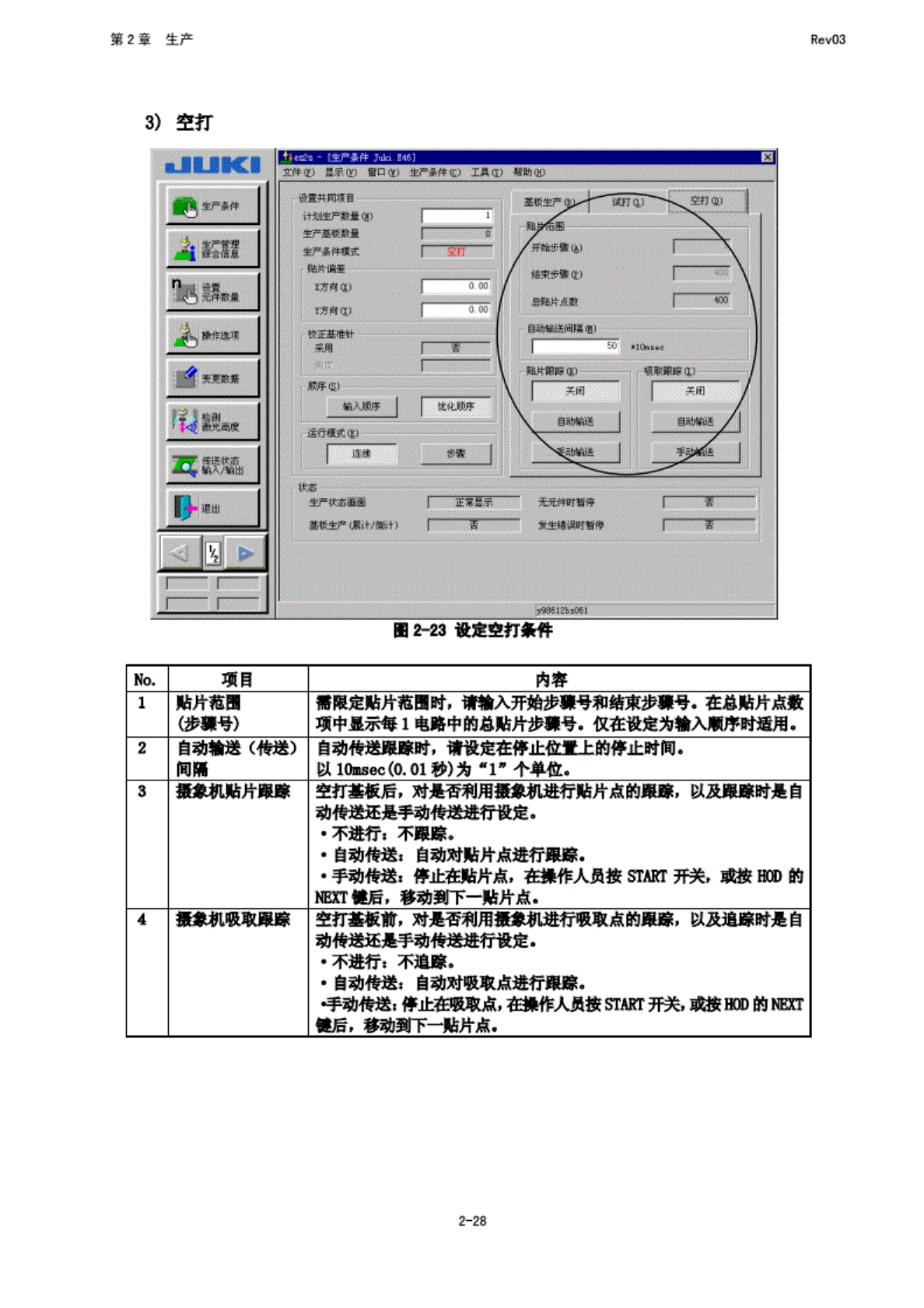第 2 章 生产 Rev03 2) 试打 图 2~22 常打 条件 的设定 N6. 项目 内客 1 舫遮 设 定进行 试打的 电路. 当为 单面基 板时, 不 使用, ・ 全 部电时 对全 部电呼 试打范 围中设 定的元 件进行 贴片. ・ 基 准电 瞄: 对基 准电瞪 俄打 范国申 设定的 元件进 行赌片 a 指 定电 Uh 对指定 的电路 试打范 围中设 定的元 件进行 贴片. 2 试 打范国 设定诚 打范 围。 • 指定购 片…