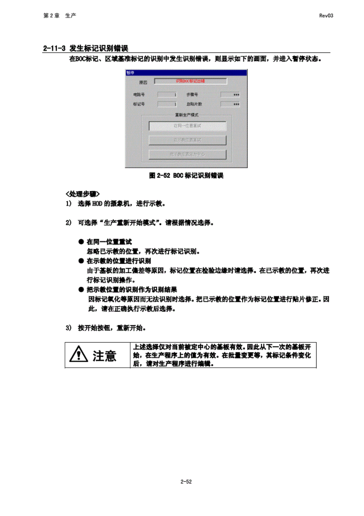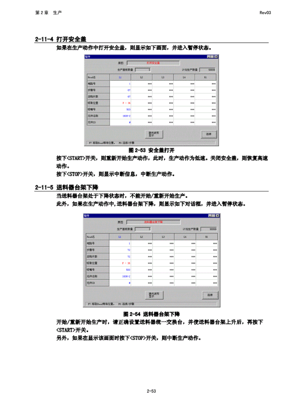 第 2 章 生产 Rev03 2-11-4 打开 安全餐 如果 在生产 动作中 打开安 全盖, 则显 示如下 画面. 并避 久暂停 状蠹. 图 M 3 安全 曾打开 按下 <STABT> 开关, 则 重新开 始生产 动作, 此时, 生产 动作为 低速. 关用安 全费, 则恢复 高速 动作. 攒下 <STOP> 开关, 则显 示中箭 信息. 中 新生产 动作. 2-11-5 送科 般台 架下降 当送 料器合 架处于 下降状 再时, 不 能…