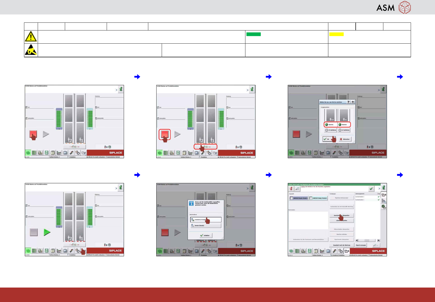 4 Wartungssymbol anklicken. 5 Symbol "Erweiterte Produktion" anklicken. 6 Symbol "Gurtschneider überprüfen" ankli-