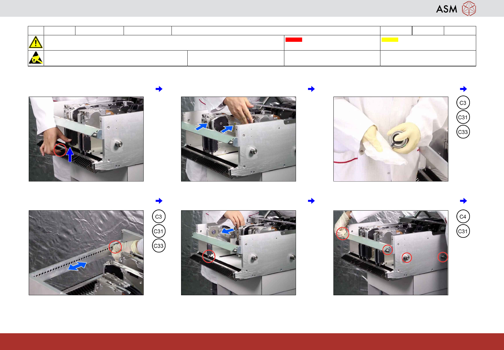 4 Zentrierleiste abwischen. 5 Förderer im Wagen verriegeln. 6 Rolle auf beiden Seiten des BE-Tisches