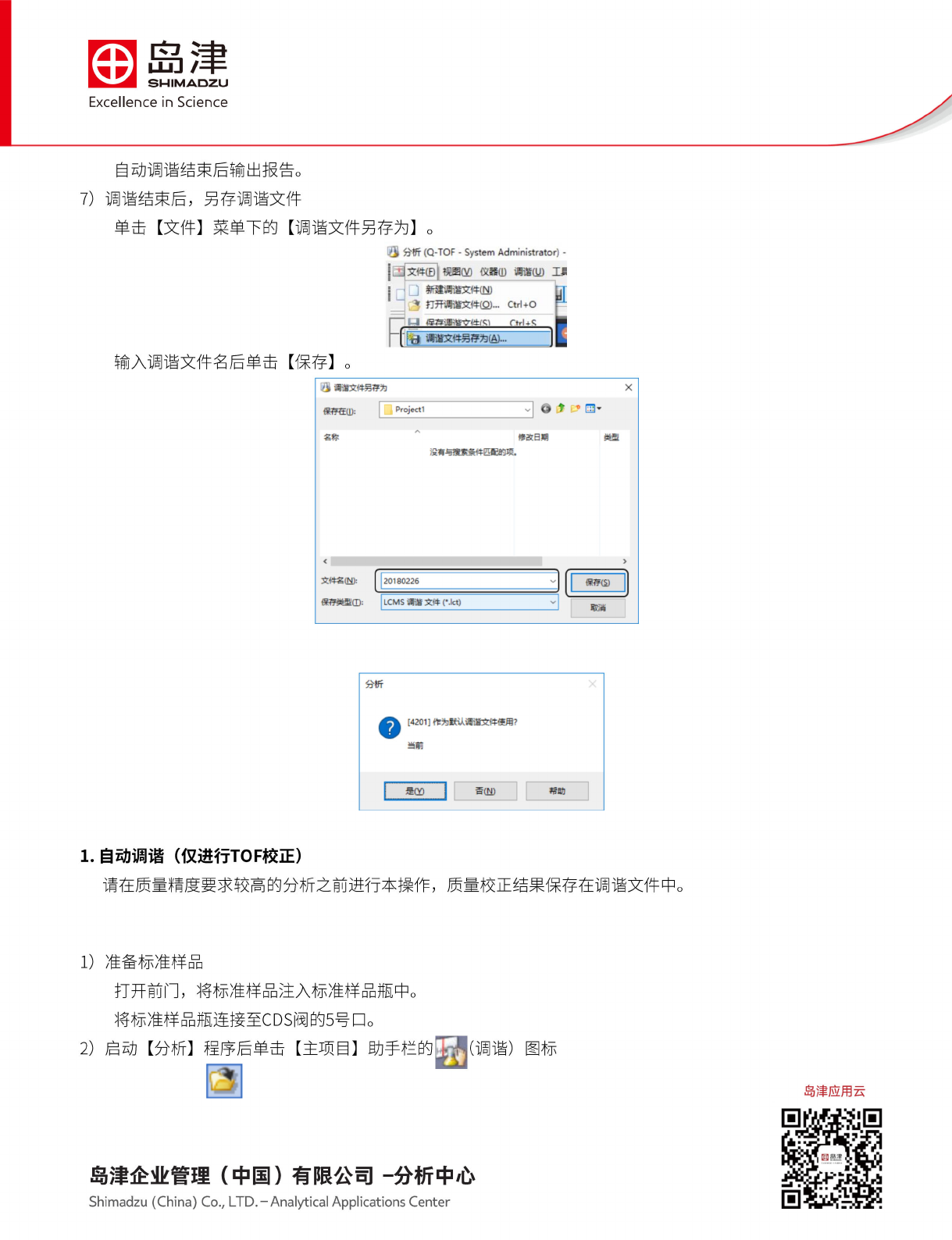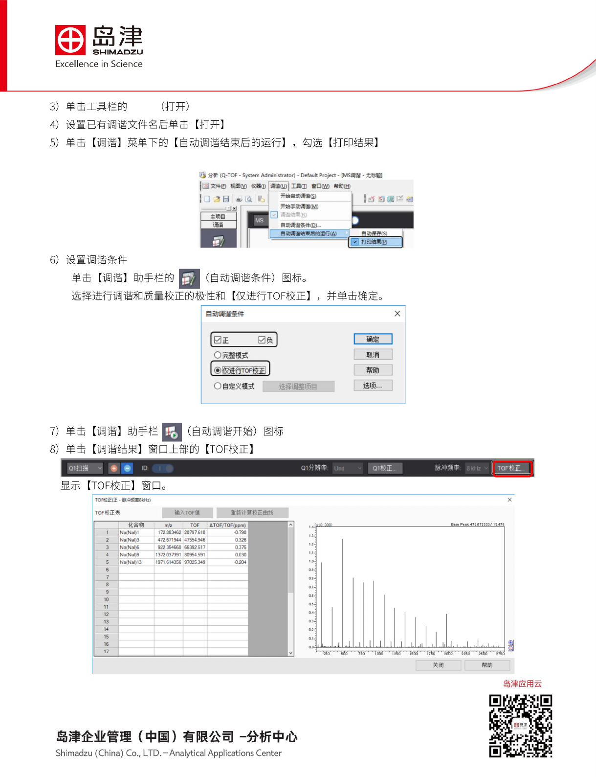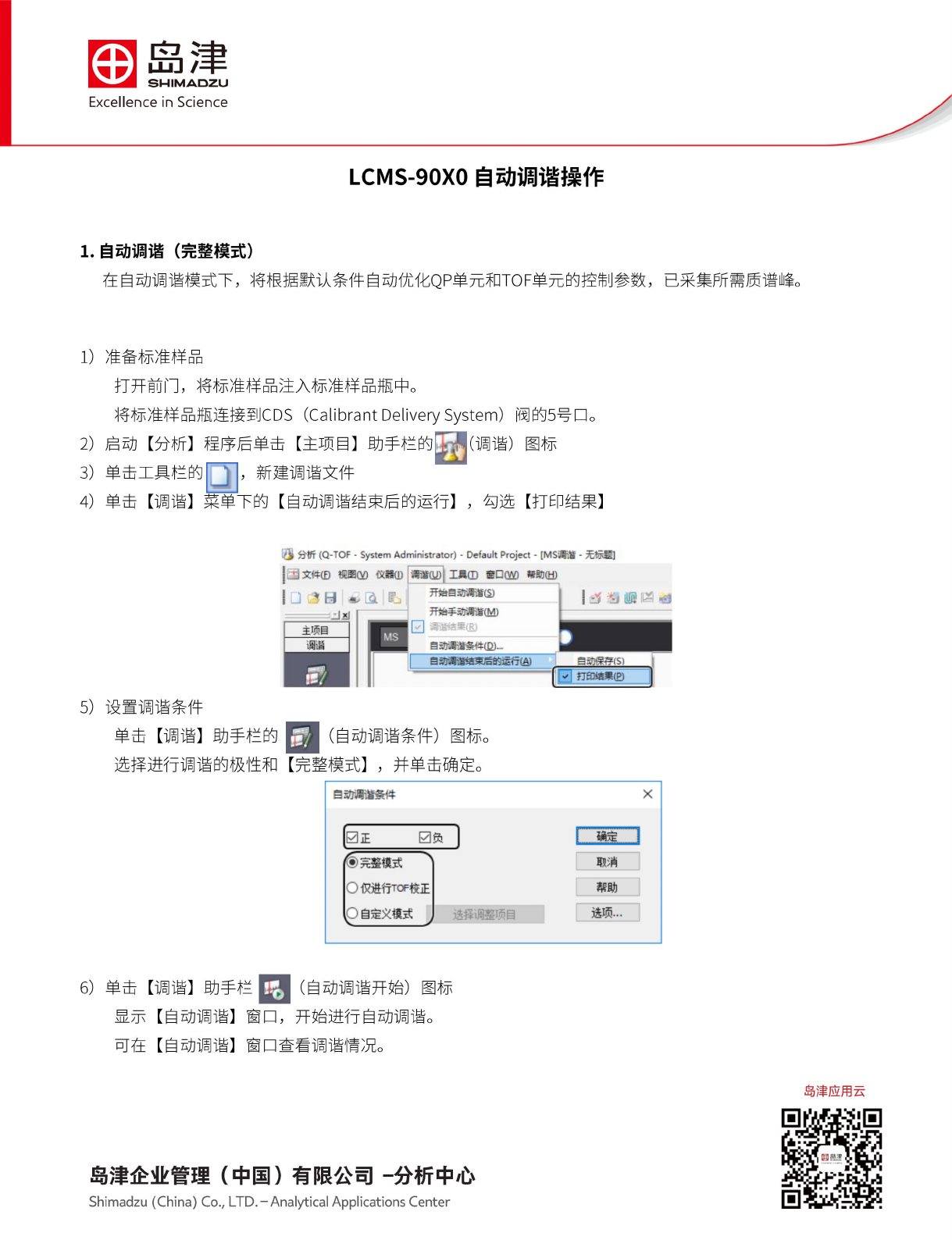 为了搜索最佳 参数,自动调谐 需要 60 分钟 左右。 • • • • • • 1. 自 动调谐 (完整 模式) 在自动 调谐模 式下, 将根 据默认 条件自 动优化 QP 单元和 TOF 单元 的控制 参数, 已采集 所需质 谱峰。 1) 2) 3) 4 ) 准备标 准样品 打开 前门, 将标 准样品 注入标 准样品 瓶中。 将标准 样品瓶 连接到 CDS (Calibrant Delivery System) 阀的 5 号口。 启动…
