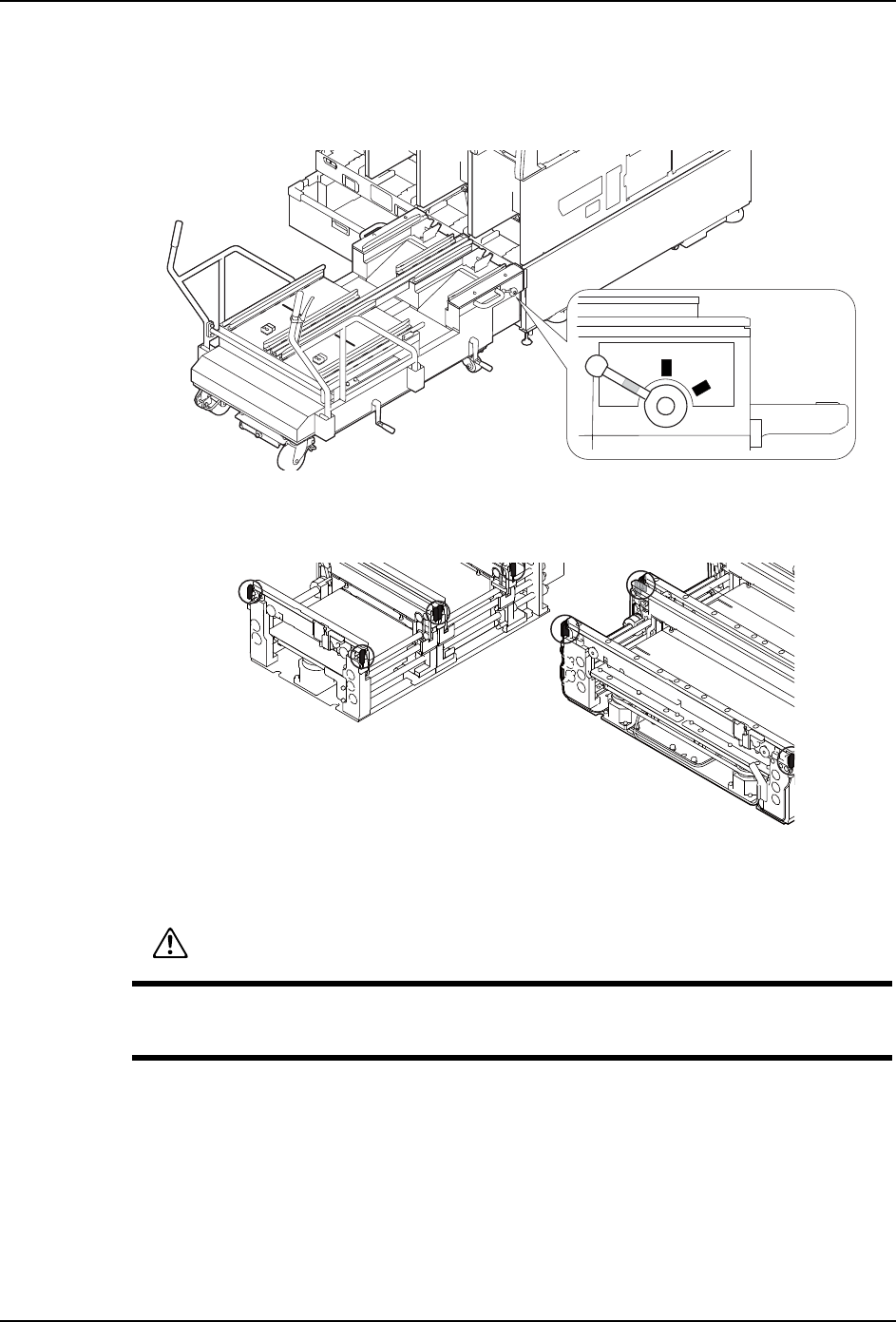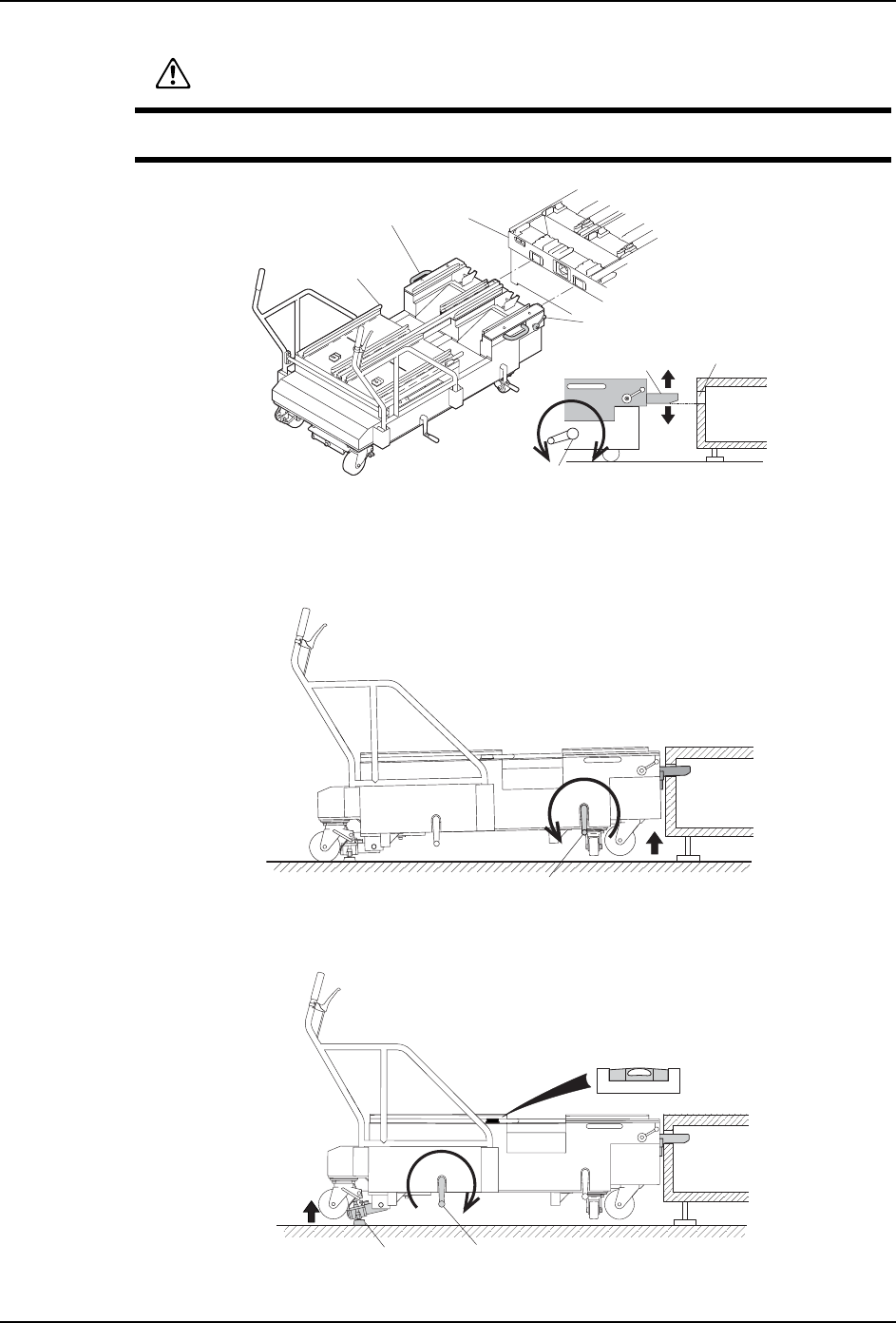 b. 旋转调整水平的摇手柄,提升后轮 ( 使升降脚接触地面 )。尽可能使水平仪的气泡处