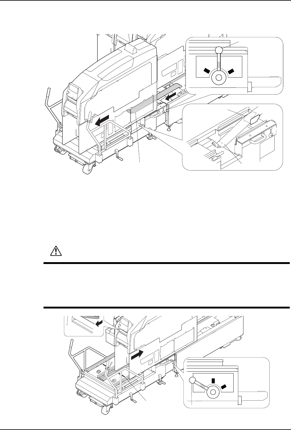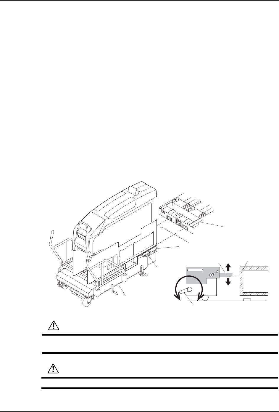 4. 基本操作 MEC-NXTIIc-3.3S 92 NXT IIc 机械手册 a. 旋转调整 高度的摇手柄 , 使 MCU-2c 的前轮从地面 腾空。(MCU-2 c 的定位头处 于由基 座的孔支撑着的状态。) b. 旋转调整水平的摇手柄,提升后轮 ( 使升降脚接触地面 )。尽可能使水平仪的气泡处 于中间的位置。 4. 将基座的电缆链套插入到模组下面 。 a. 将 MCU-2c 的锁定 手柄转回到 「SAFE」的位置 上。 b. 请握…