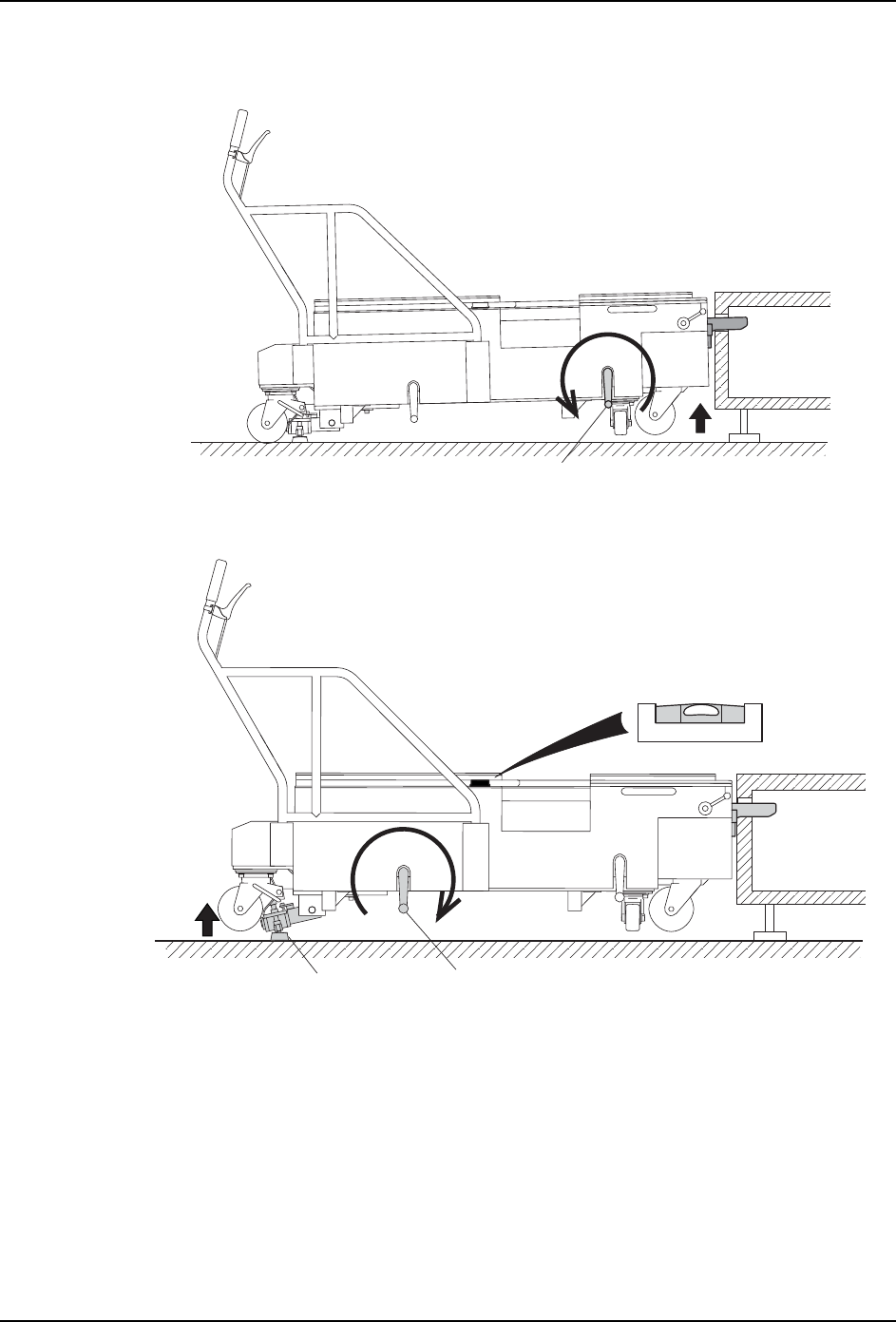 b. 旋转调整水平的摇手柄,提升后轮 ( 使升降脚接触地面 )。尽可能使水平仪的气泡处