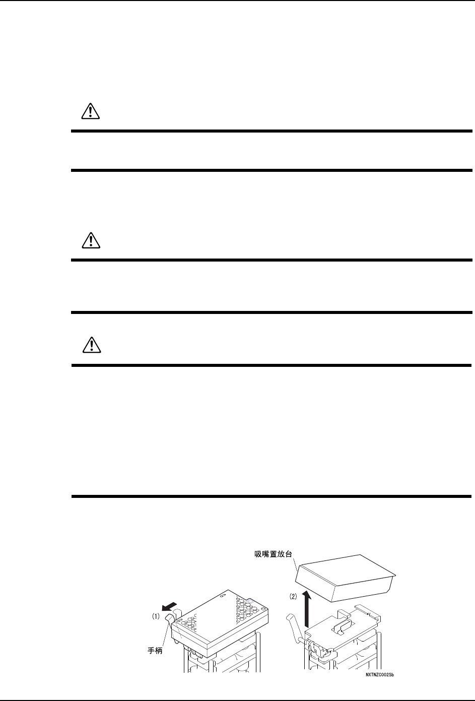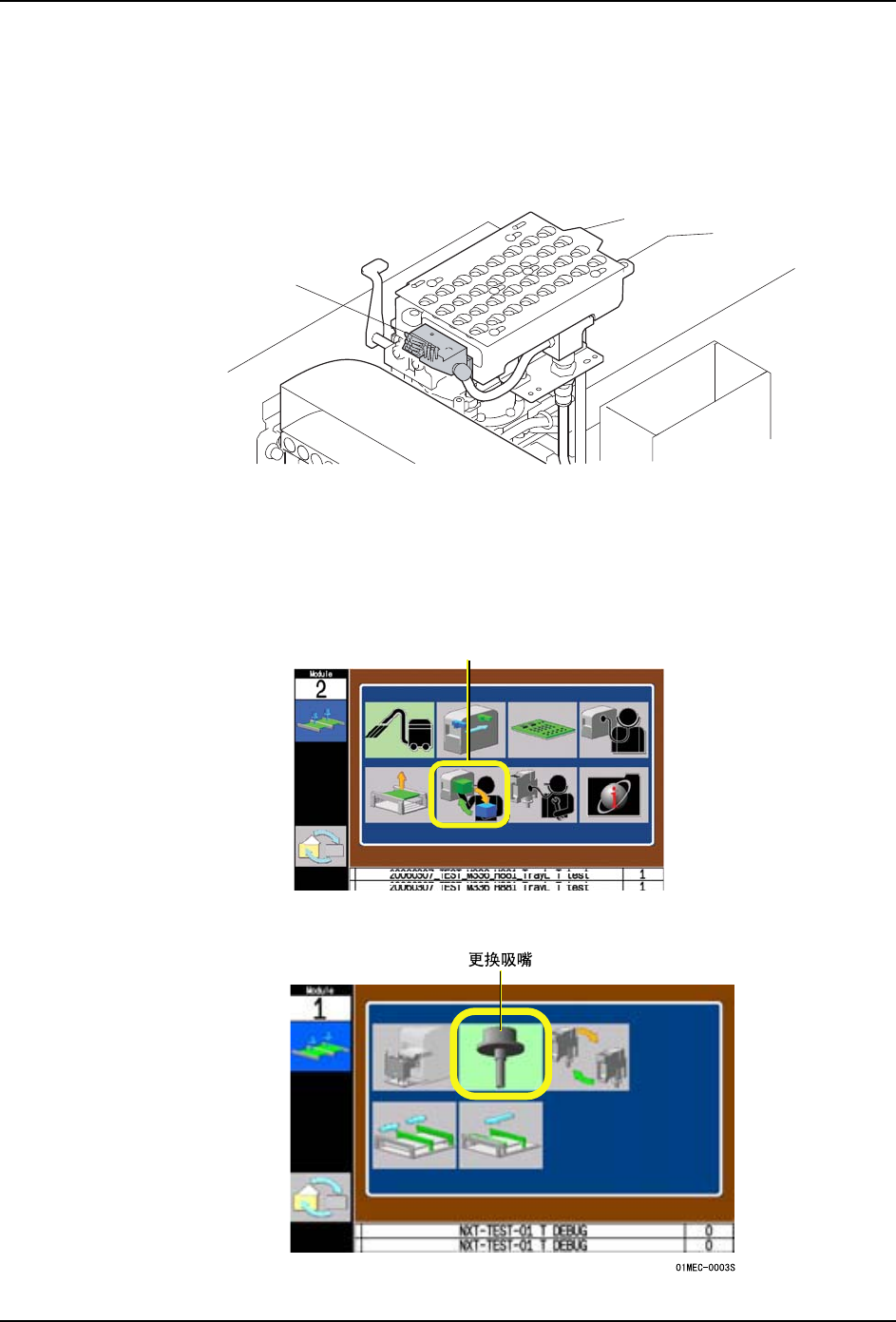 MEC-NXTIIc-3.3S 4. 基本操作 NXT IIc 机械手册 115 4.5 吸嘴置放台的拆除 / 安装 吸嘴置放台的种类与搭载的工作 头类型配合使用。 在更换贴装工作头时, 请将吸嘴置放台也 同时更换成相应的类型。 注意 )置放台类型清扫刷单元对应的置放台上,使用可以安装 32 根的吸嘴 (ND32C, ND32D) 的类型时,在刷子部分请注意不要用力进行操作。安装刷子的支架有可能变形。 4.5.1 拆除方法 1. 停止模…