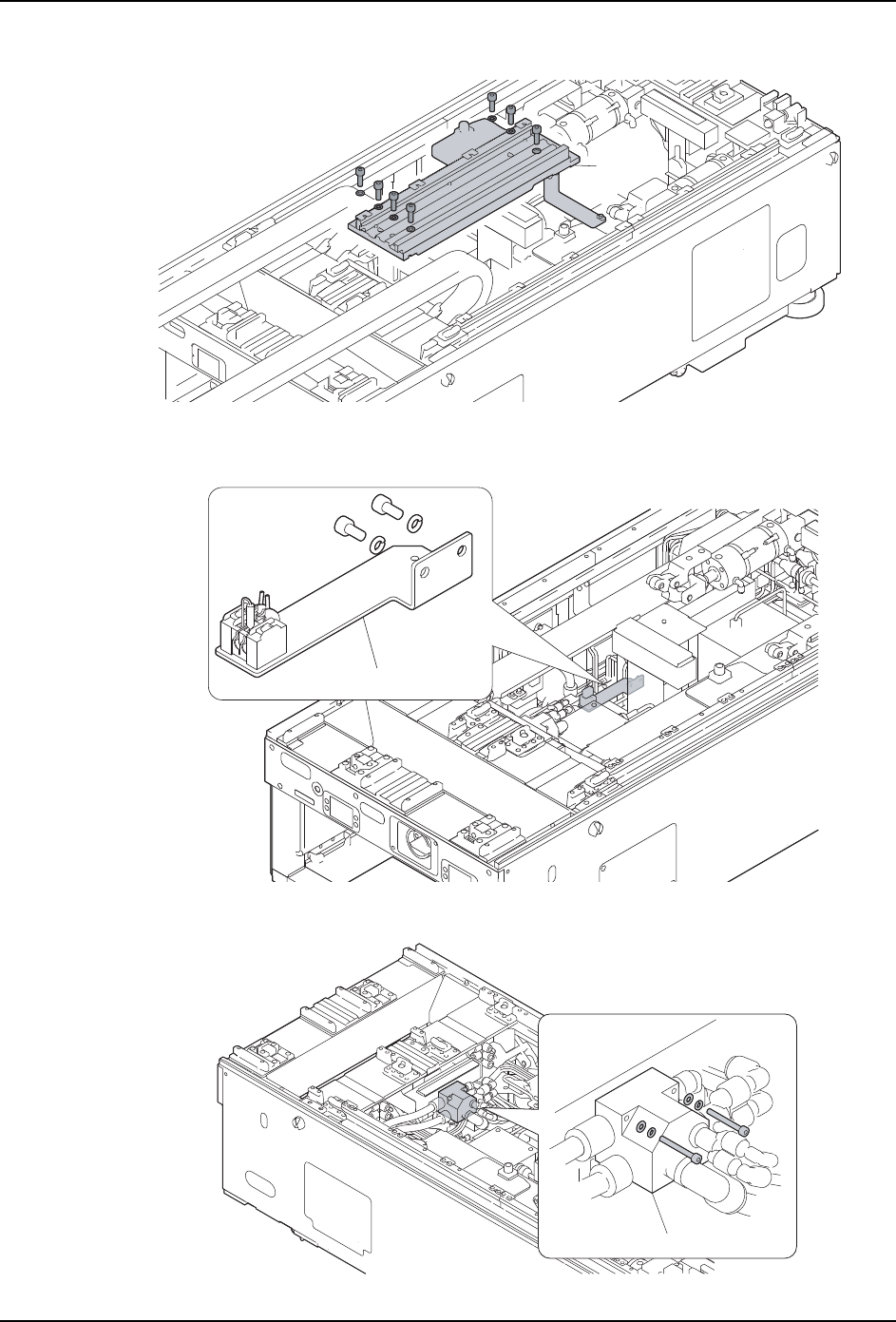 9. 请拆除真空泵温度保险丝支架的固定螺栓 (2 根)。支架请放在不妨碍从基座上拆除真